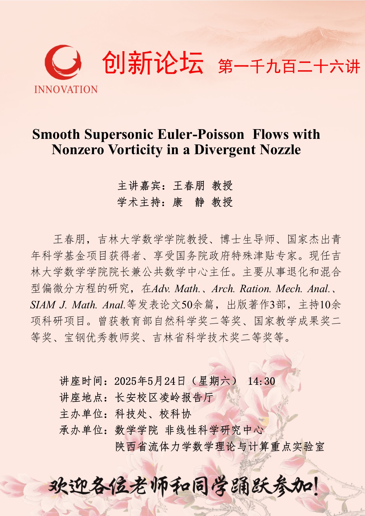 王春朋 教授 开云手机网页版登录入口创新论坛第一千九百二十六讲:Smooth Supersonic Euler-Poisson Flows with Nonzero Vorticity in a Divergent Nozzle 讲座时间 2025年5月24日(星期六) 14:30 讲座地点 长安校区凌岭报告厅 讲座人介绍 王春朋 教授 讲座内容
