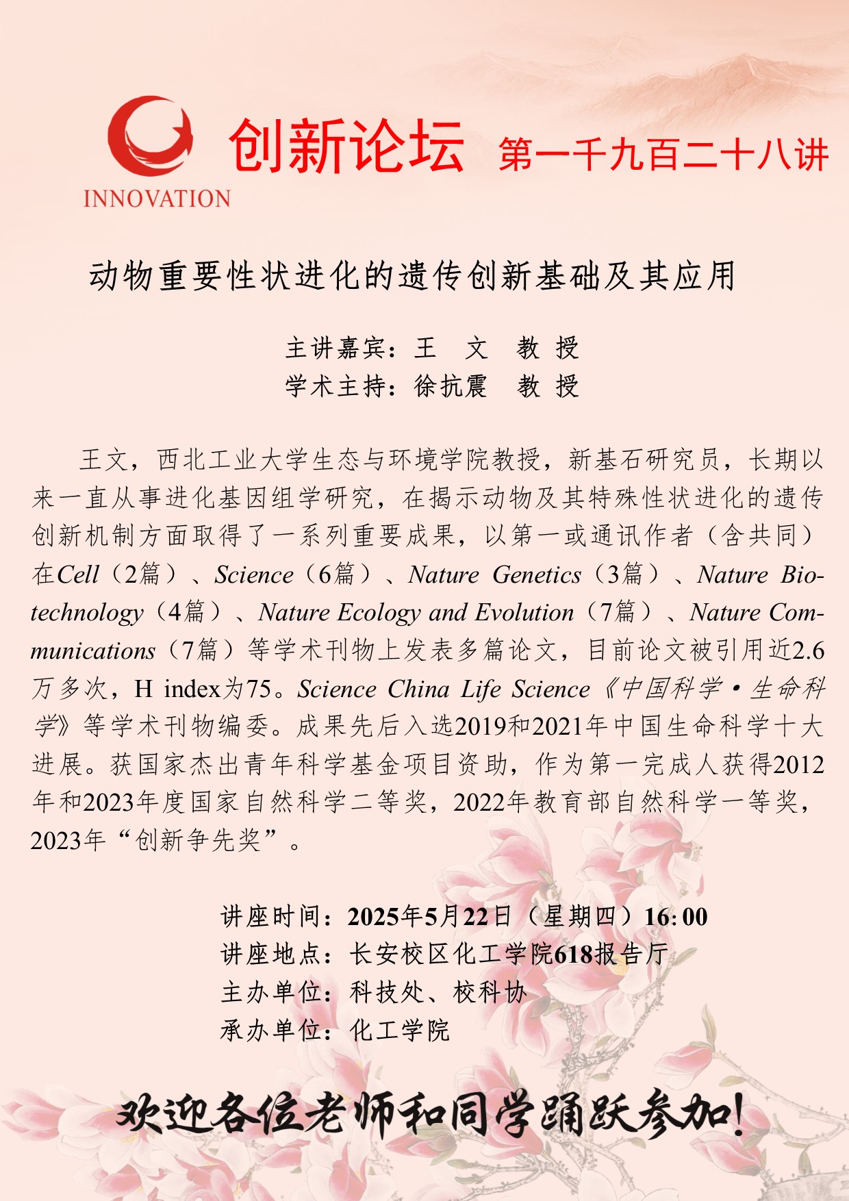 王文 教授 开云手机网页版登录入口创新论坛第一千九百二十八讲:动物重要性状进化的遗传创新基础及其应用 讲座时间 2025年5月22日(星期四)16:00 讲座地点 长安校区化工学院618报告厅 讲座人介绍 王文 教授 讲座内容