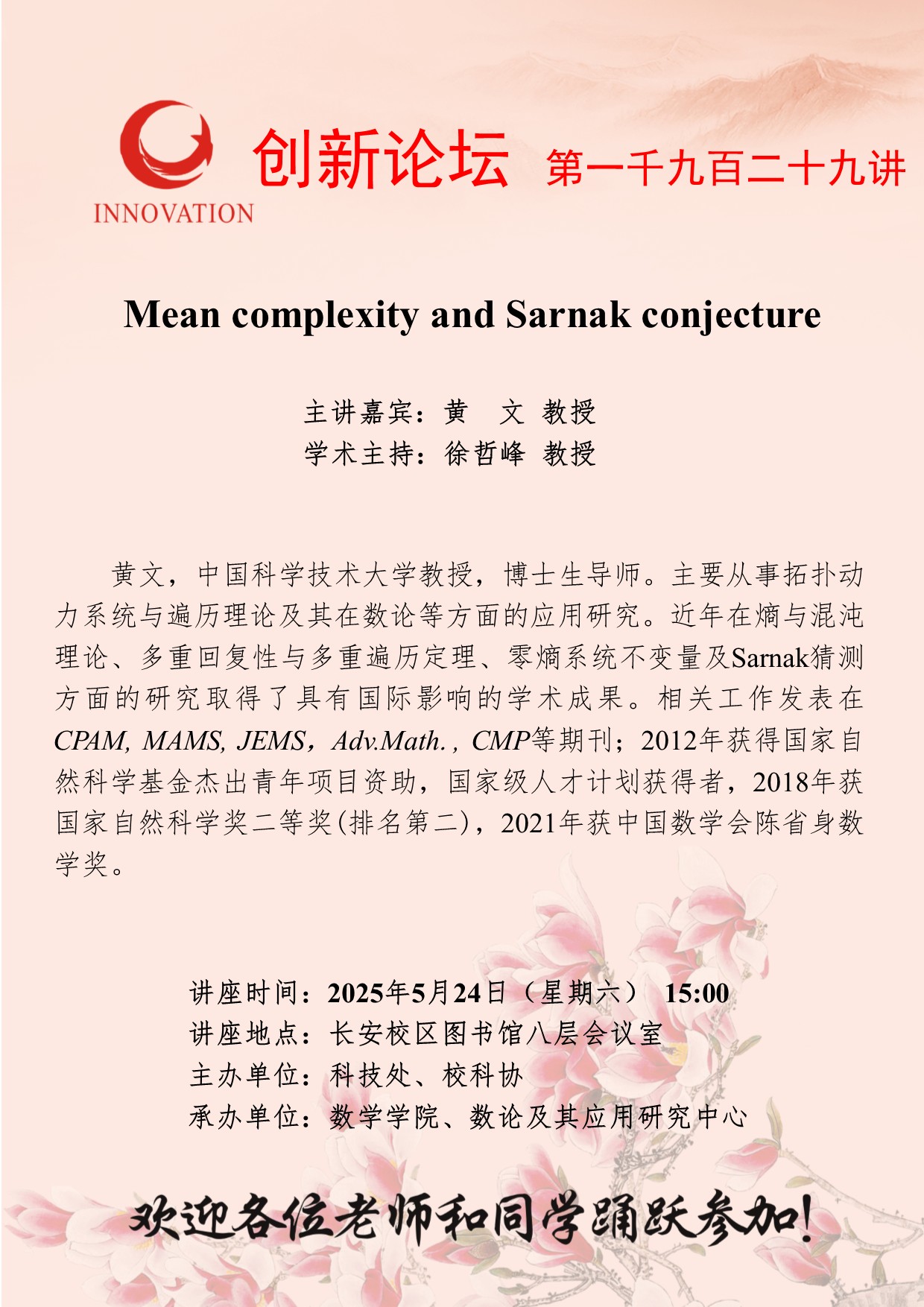 黄文 教授 开云手机网页版登录入口创新论坛第一千九百二十九讲:Mean complexity and Sarnak conjecture 讲座时间 2025年5月24日(星期六) 15:00 讲座地点 长安校区图书馆八层会议室 讲座人介绍 黄文 教授 讲座内容