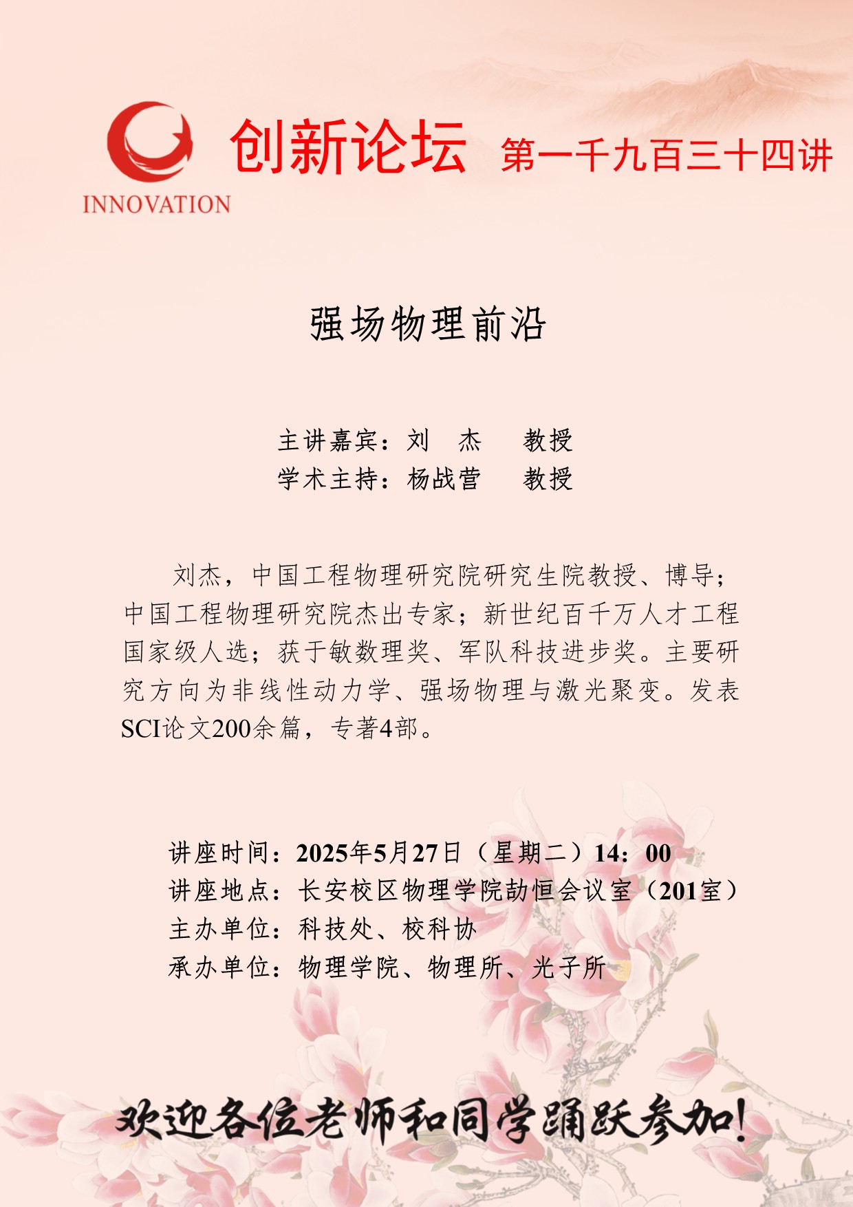 刘杰 教授 开云手机网页版登录入口创新论坛第一千九百三十四讲:强场物理前沿 讲座时间 2025年5月27日(星期二)14:00 讲座地点 长安校区物理学院劼恒会议室(201室) 讲座人介绍 刘杰 教授 讲座内容