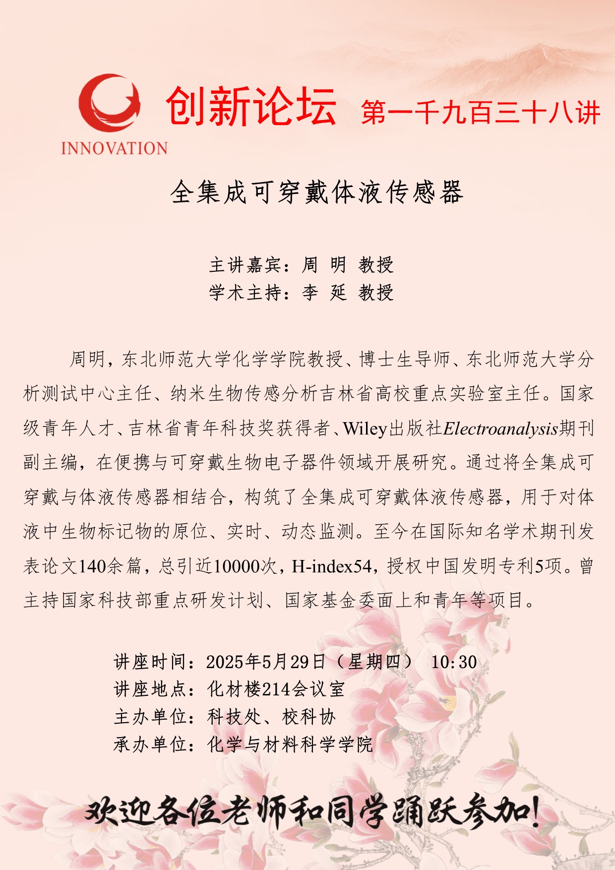 周明 教授 开云手机网页版登录入口创新论坛第一千九百三十八讲:全集成可穿戴体液传感器 讲座时间 2025年5月29日(星期四) 10:30 讲座地点 化材楼214会议室 讲座人介绍 周明 教授 讲座内容