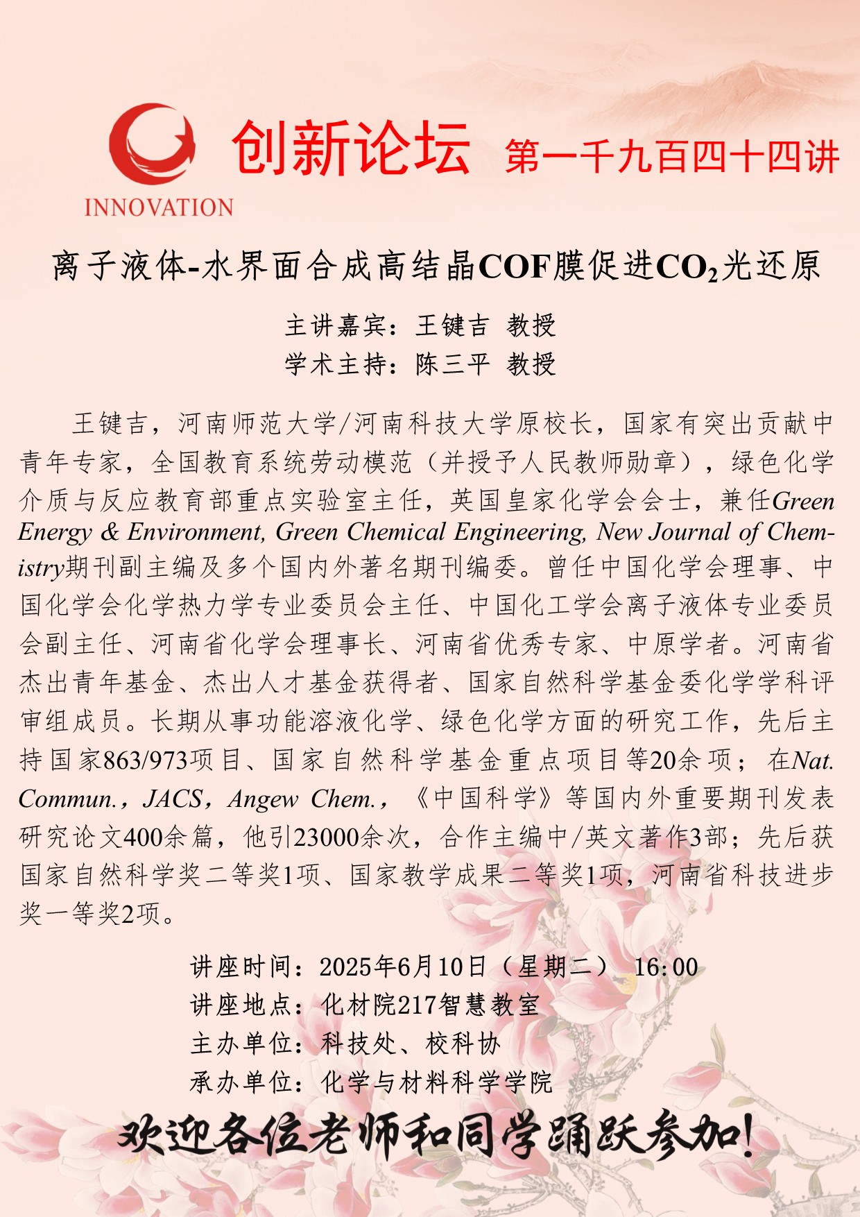 王键吉 教授 开云手机网页版登录入口创新论坛第一千九百四十四讲:离子液体-水界面合成高结晶COF膜促进CO2光还原 讲座时间 2025年6月10日(星期二) 16:00 讲座地点 化材院217智慧教室 讲座人介绍 王键吉 教授 讲座内容