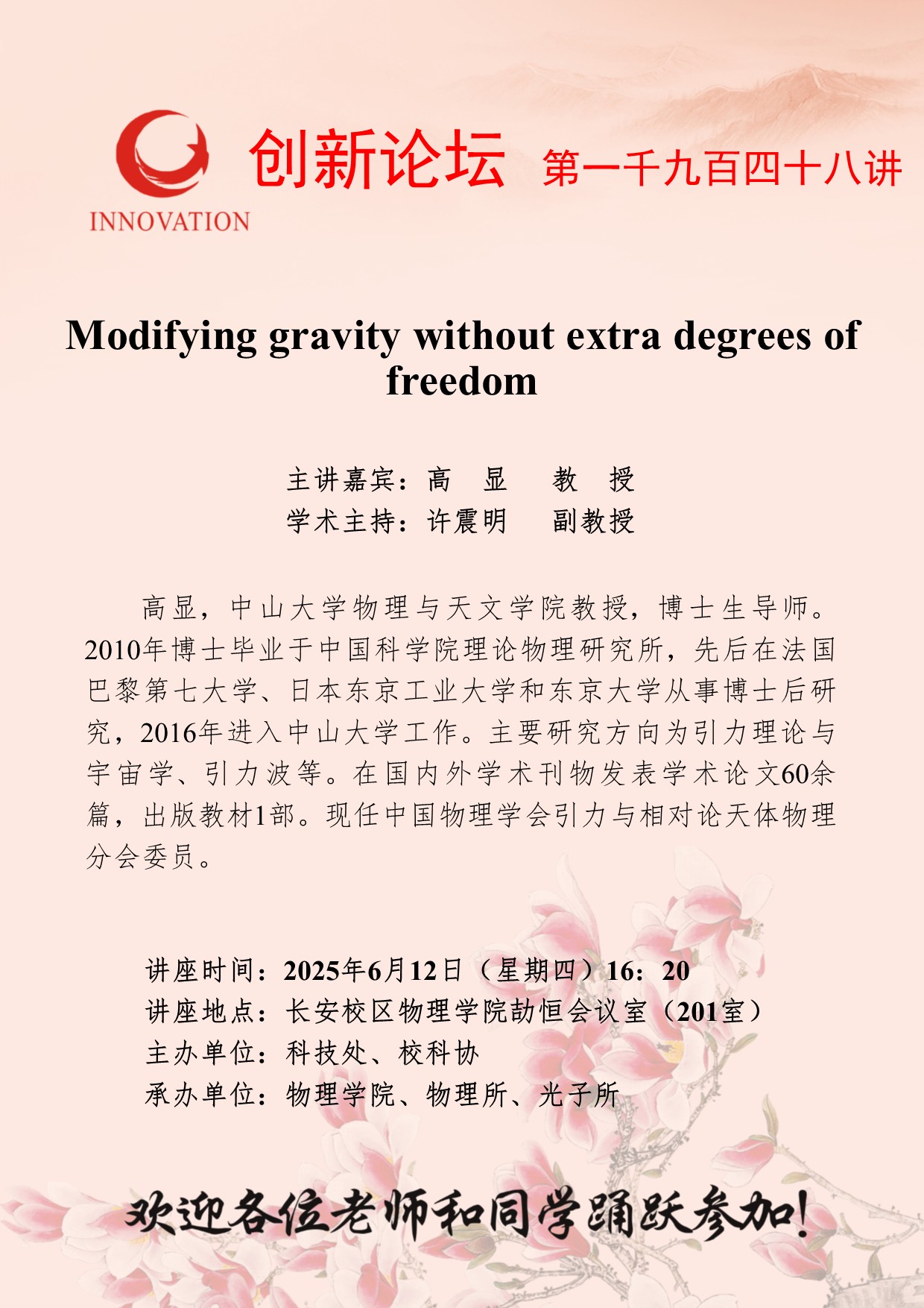 高显 教授 开云手机网页版登录入口创新论坛第一千九百四十八讲:Modifying gravity without extra degrees of freedom 讲座时间 2025年6月12日(星期四)16:20 讲座地点 长安校区物理学院劼恒会议室(201室) 讲座人介绍 高显 教授 讲座内容