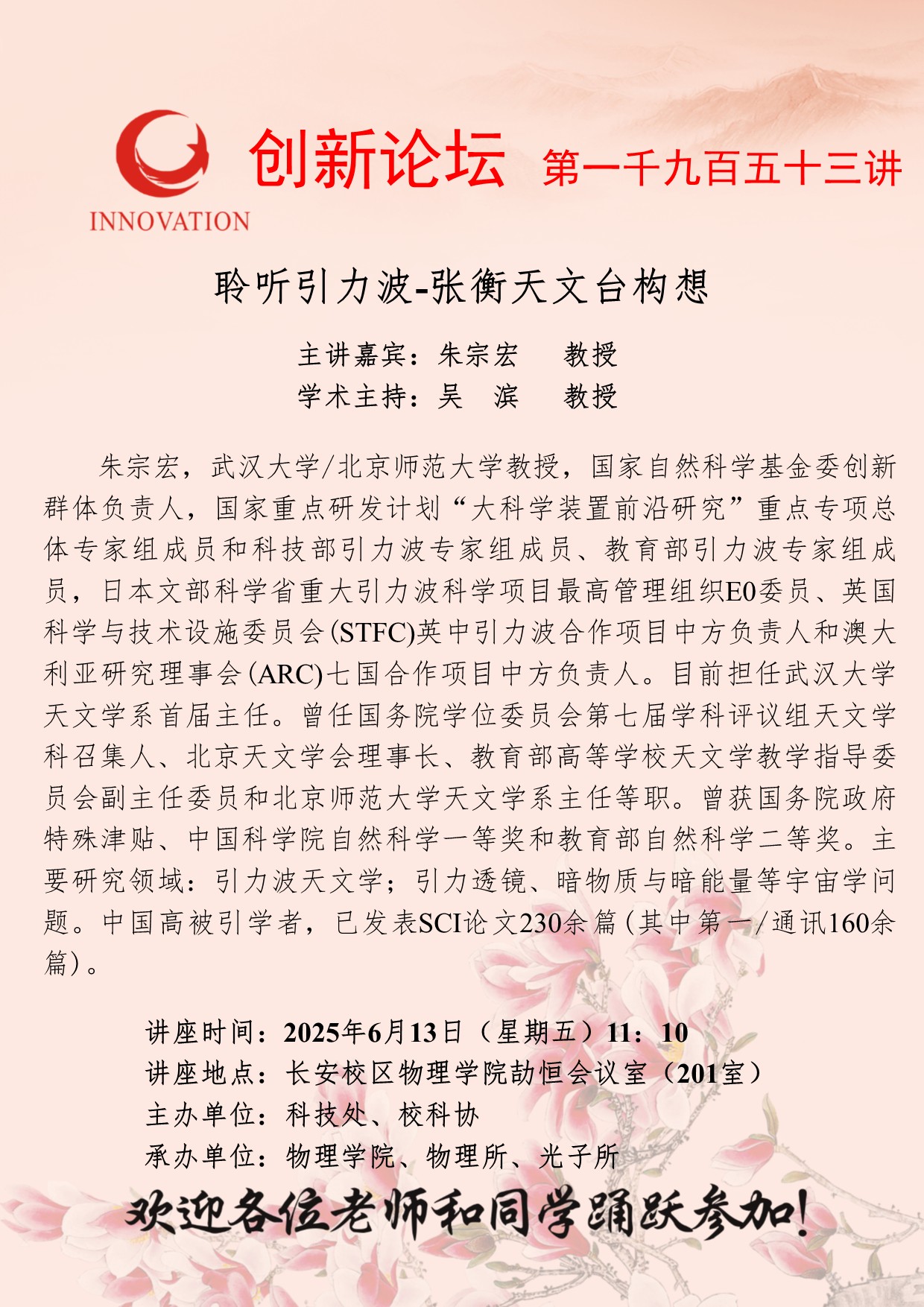 朱宗宏 教授 开云手机网页版登录入口创新论坛第一千九百五十三讲:聆听引力波-张衡天文台构想 讲座时间 2025年6月13日(星期五)11:10 讲座地点 长安校区物理学院劼恒会议室(201室) 讲座人介绍 朱宗宏 教授 讲座内容