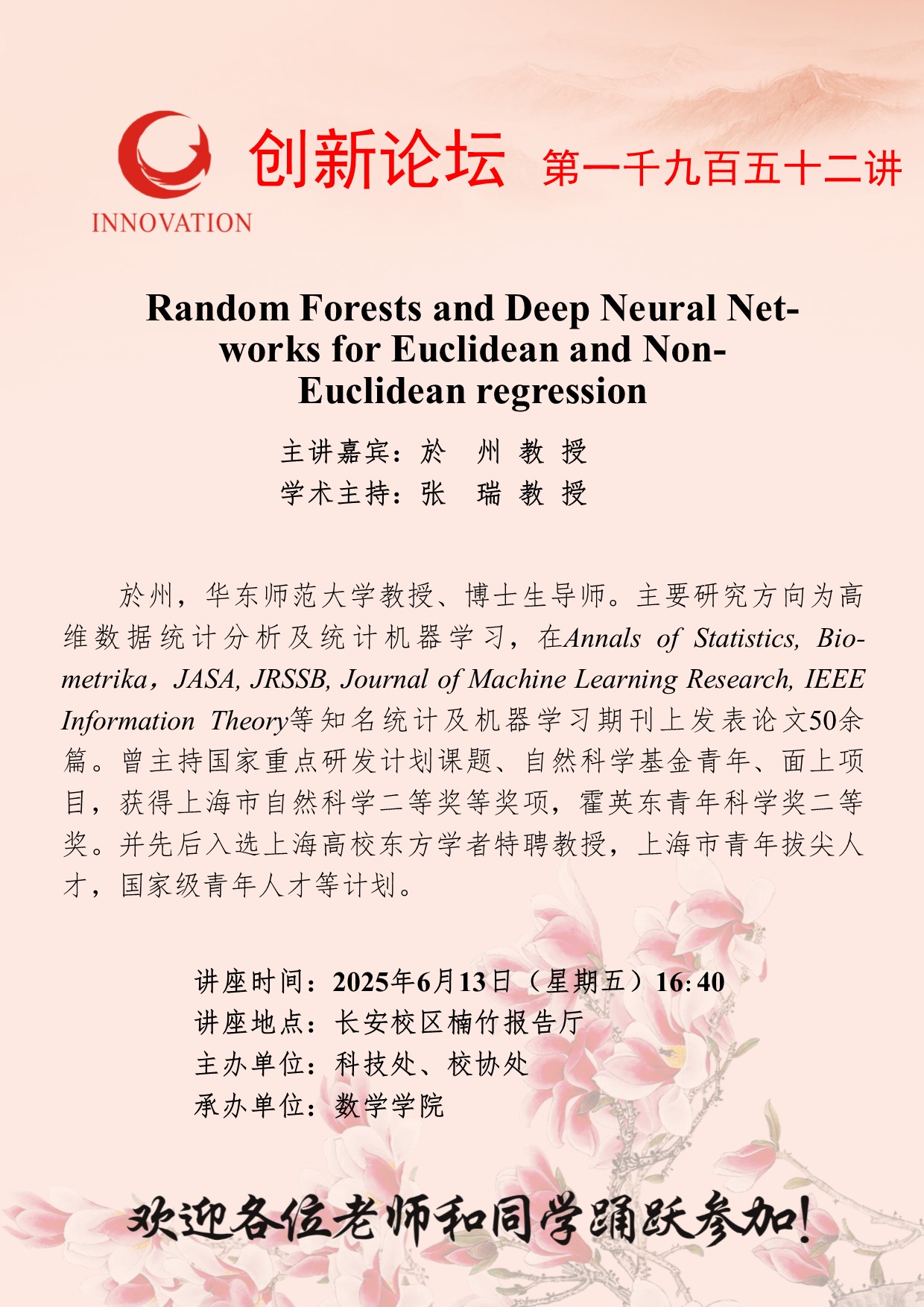 於州 教授 开云手机网页版登录入口创新论坛第一千九百五十二讲:Random Forests and Deep Neural Networks for Euclidean and Non-Euclidean regression 讲座时间 2025年6月13日(星期五)16:40 讲座地点 长安校区楠竹报告厅 讲座人介绍 於州 教授 讲座内容