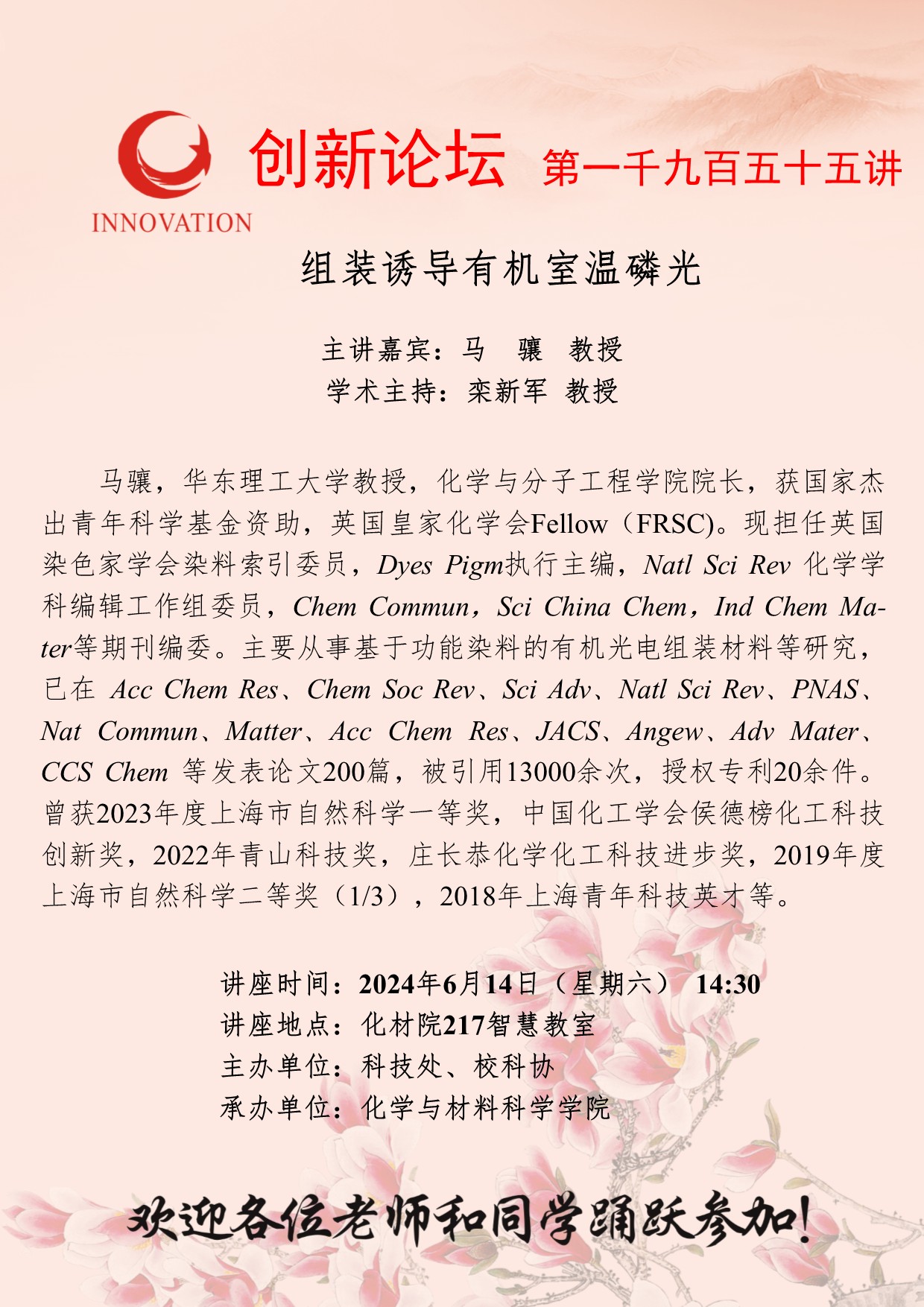 马骧 教授 开云手机网页版登录入口创新论坛第一千九百五十五讲:组装诱导有机室温磷光 讲座时间 2024年6月14日(星期六) 14:30 讲座地点 化材院217智慧教室 讲座人介绍 马骧 教授 讲座内容