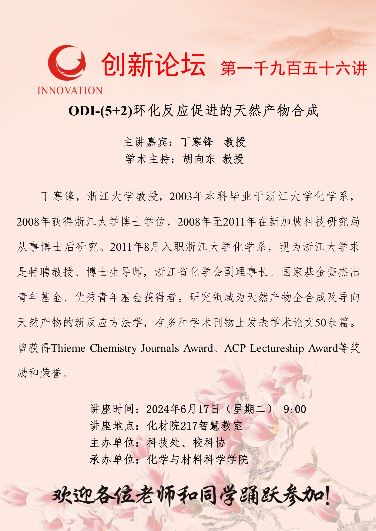丁寒锋 教授 开云手机网页版登录入口创新论坛第一千九百五十六讲:ODI-(5+2)环化反应促进的天然产物合成 讲座时间 2024年6月17日(星期二) 9:00 讲座地点 化材院217智慧教室 讲座人介绍 丁寒锋 教授 讲座内容