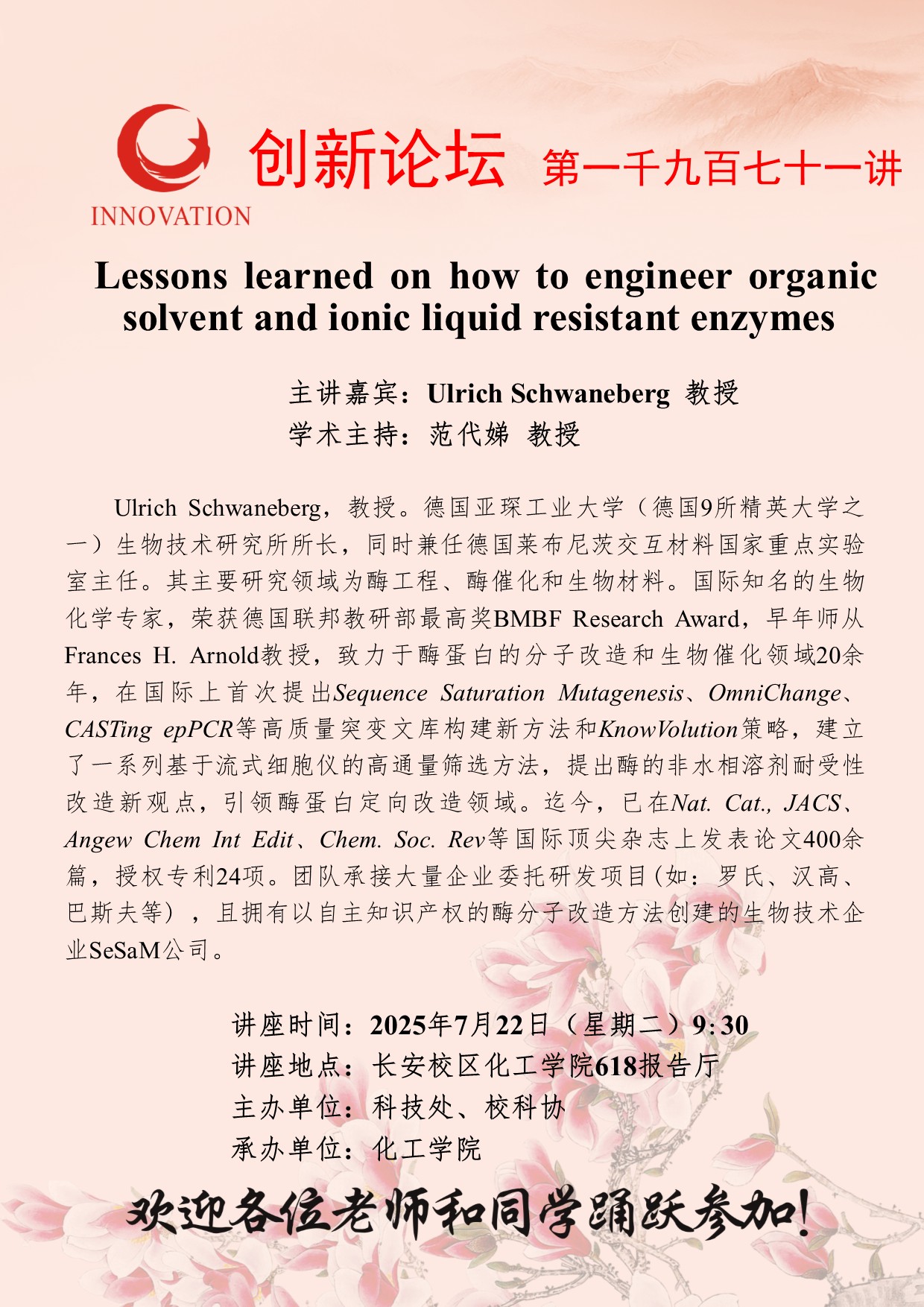 Ulrich Schwaneberg 教授 开云手机网页版登录入口创新论坛第一千九百七十一讲:Lessons learned on how to engineer organic solvent and ionic liquid resistant enzymes 讲座时间 2025年7月22日(星期二)9:30 讲座地点 长安校区化工学院618报告厅 讲座人介绍 Ulrich Schwaneberg 教授 讲座内容
