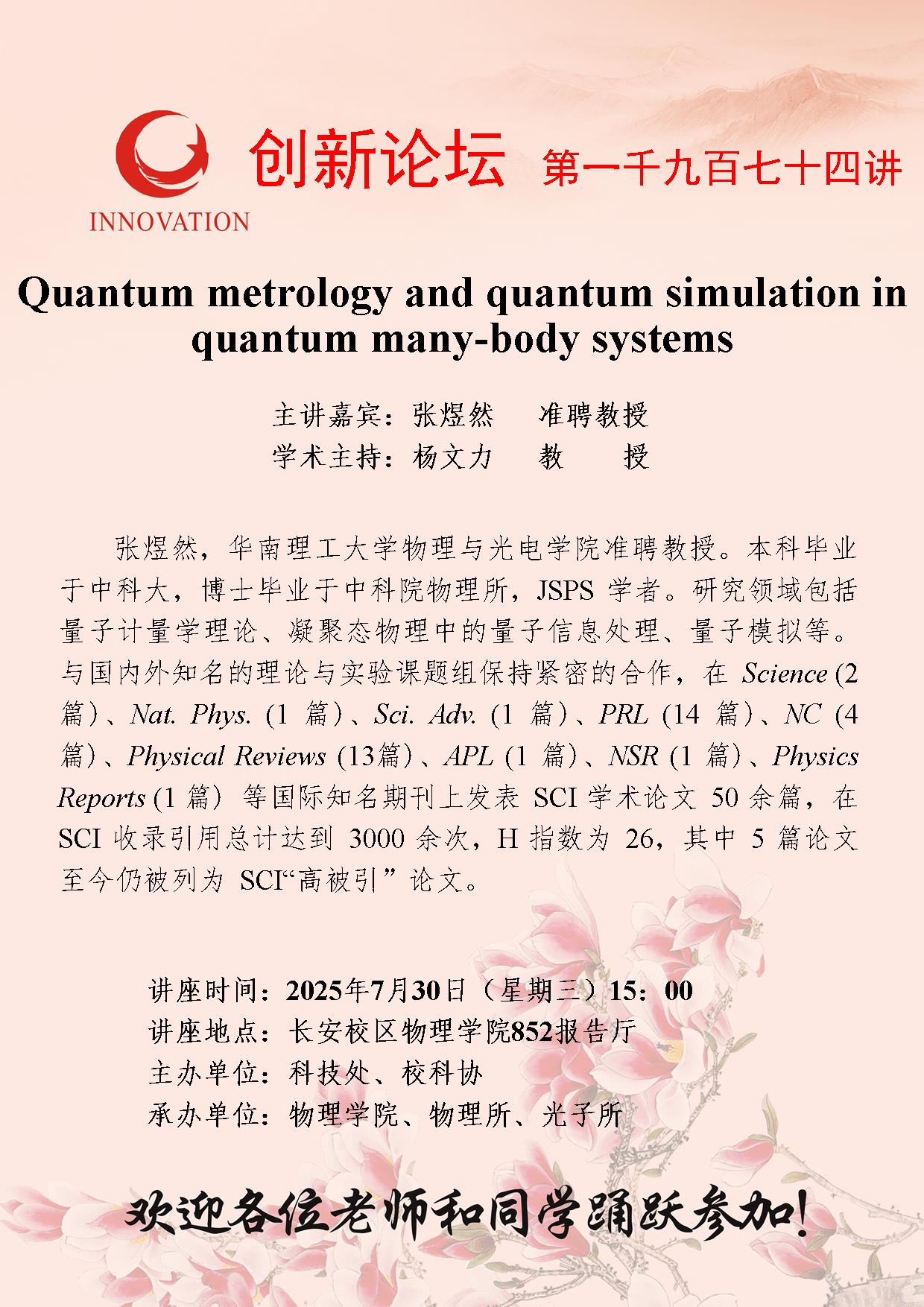 张煜然 准聘教授 开云手机网页版登录入口创新论坛第一千九百七十四讲:Quantum metrology and quantum simulation in quantum many-body systems 讲座时间 2025年7月30日(星期三)15:00 讲座地点 长安校区物理学院852报告厅 讲座人介绍 张煜然 准聘教授 讲座内容