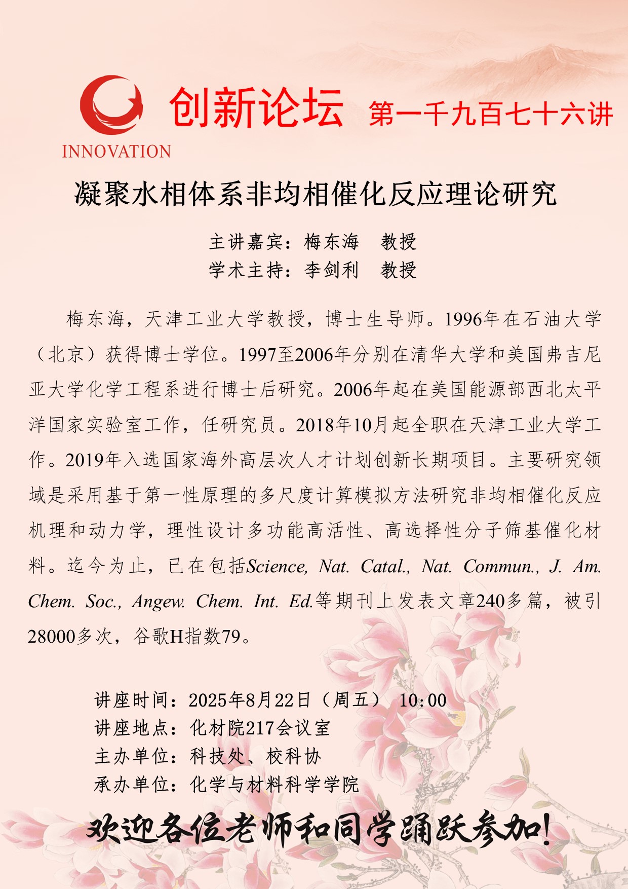 梅东海 教授 开云手机网页版登录入口创新论坛第一千九百七十六讲:凝聚水相体系非均相催化反应理论研究 讲座时间 2025年8月22日(星期五) 10:00 讲座地点 化材学院217智慧教室 讲座人介绍 梅东海 教授 讲座内容