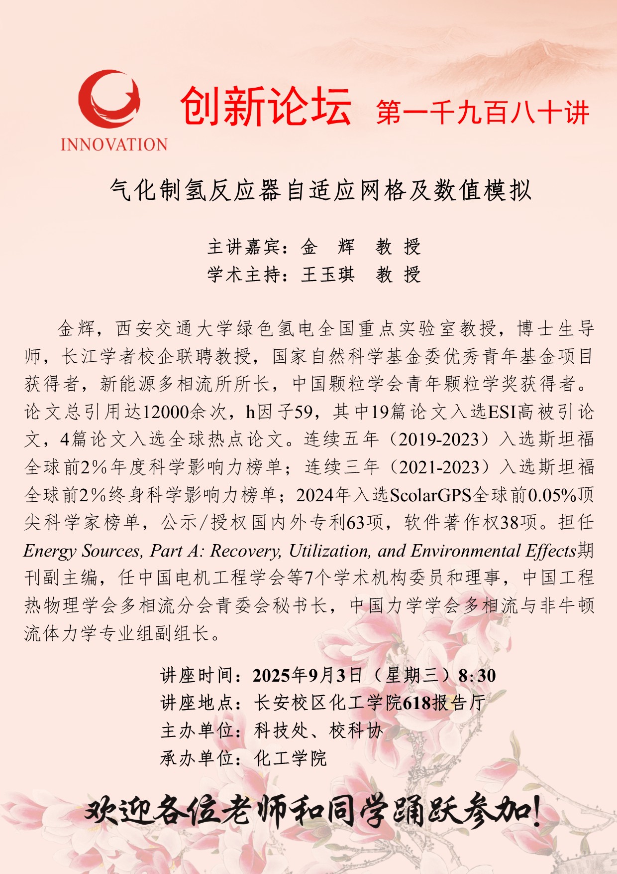 金辉 教授 开云手机网页版登录入口创新论坛第一千九百八十讲:气化制氢反应器自适应网格及数值模拟 讲座时间 2025年9月3日(星期三)8:30 讲座地点 长安校区化工学院618报告厅 讲座人介绍 金辉 教授 讲座内容