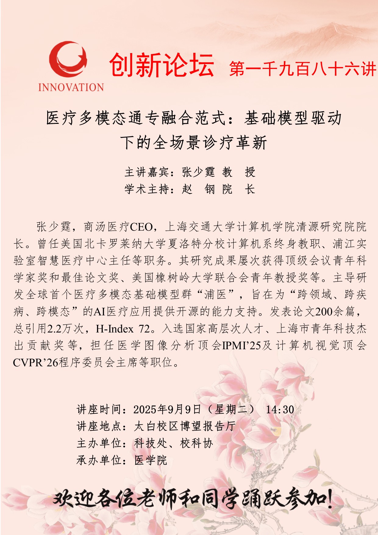 张少霆 教 授 开云手机网页版登录入口创新论坛第一千九百八十六讲:医疗多模态通专融合范式:基础模型驱动下的全场景诊疗革新 讲座时间 2025年9月9日(星期二) 14:30 讲座地点 太白校区博望报告厅 讲座人介绍 张少霆 教 授 讲座内容 fu