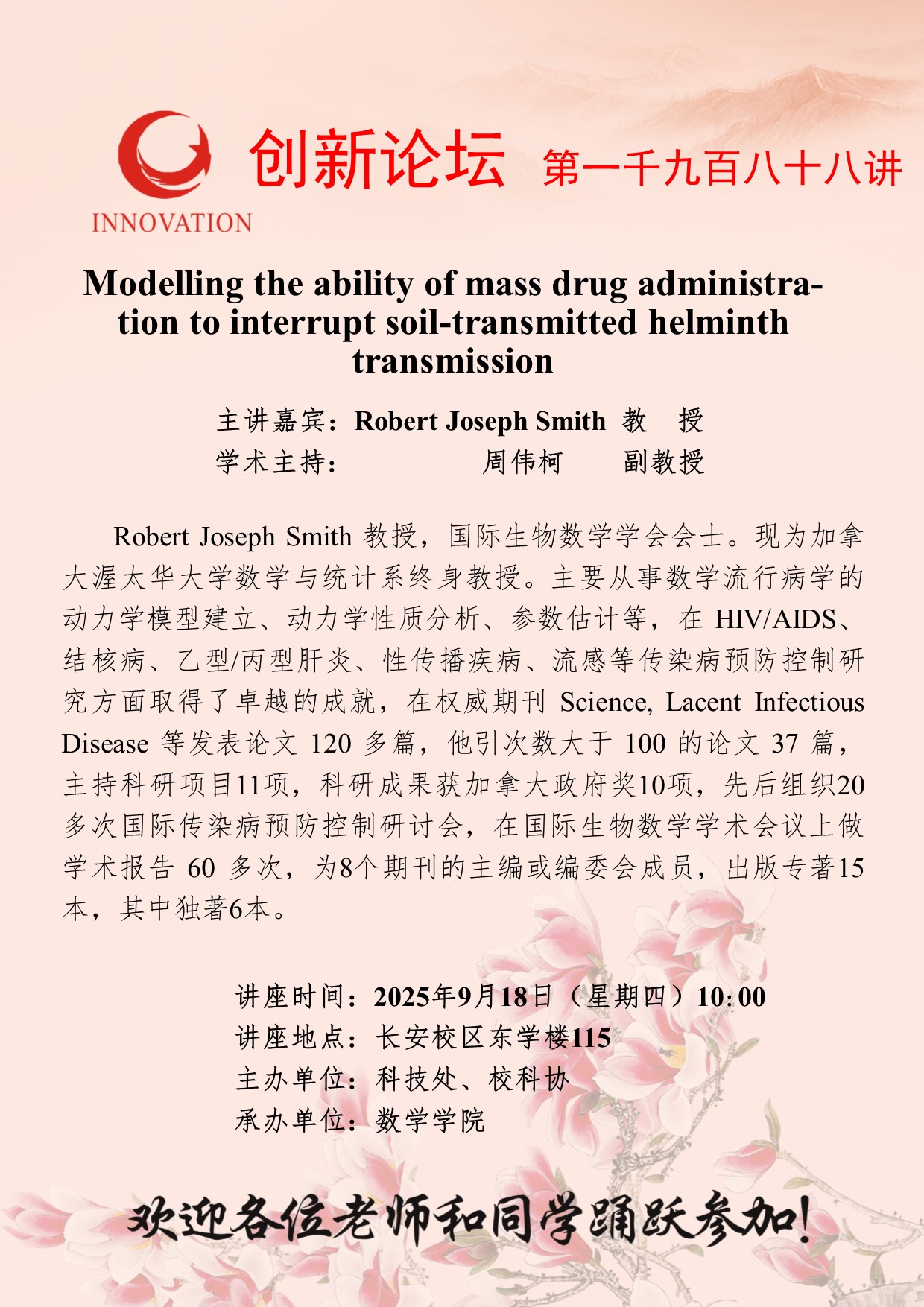 Robert Joseph Smith 教授 开云手机网页版登录入口创新论坛第一千九百八十八讲:Modelling the ability of mass drug administration to interrupt soil-transmitted helminth transmission 讲座时间 2025年9月18日(星期四)10:00 讲座地点 长安校区东学楼115 讲座人介绍 Robert Joseph Smith 教授 讲座内容
