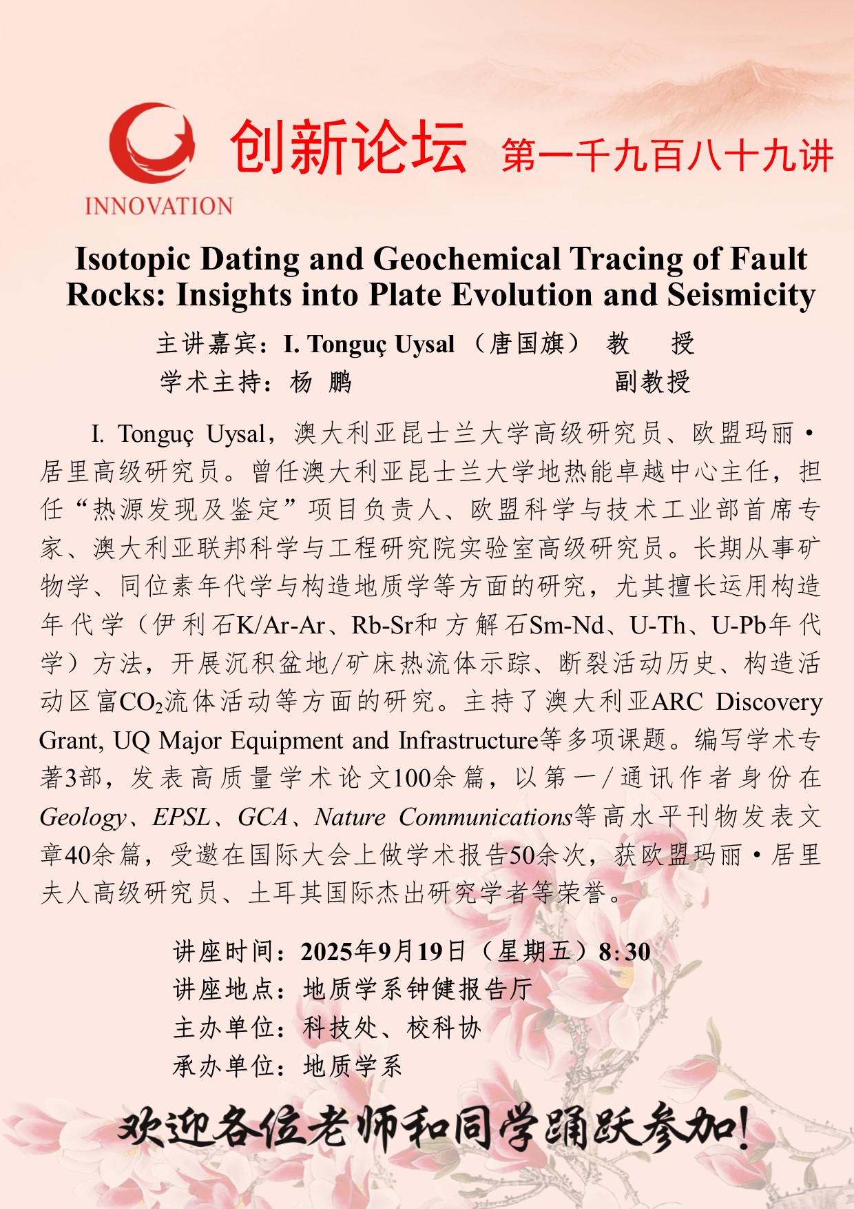 I. Tonguç Uysal 教授 开云手机网页版登录入口创新论坛第一千九百八十九讲:Isotopic Dating and Geochemical Tracing of Fault Rocks: Insights into Plate Evolution and Seismicity 讲座时间 2025年9月19日(星期五)8:30 讲座地点 地质学系钟健报告厅 讲座人介绍 I. Tonguç Uysal 教授 讲座内容