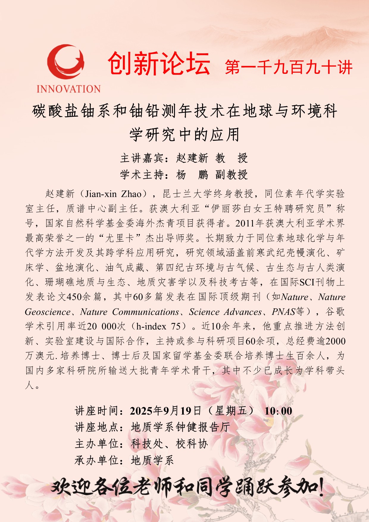 赵建新 教授 开云手机网页版登录入口创新论坛第一千九百九十讲:碳酸盐铀系和铀铅测年技术在地球与环境科学研究中的应用 讲座时间 2025年9月19日(星期五) 10:00 讲座地点 地质学系钟健报告厅 讲座人介绍 赵建新 教授 讲座内容