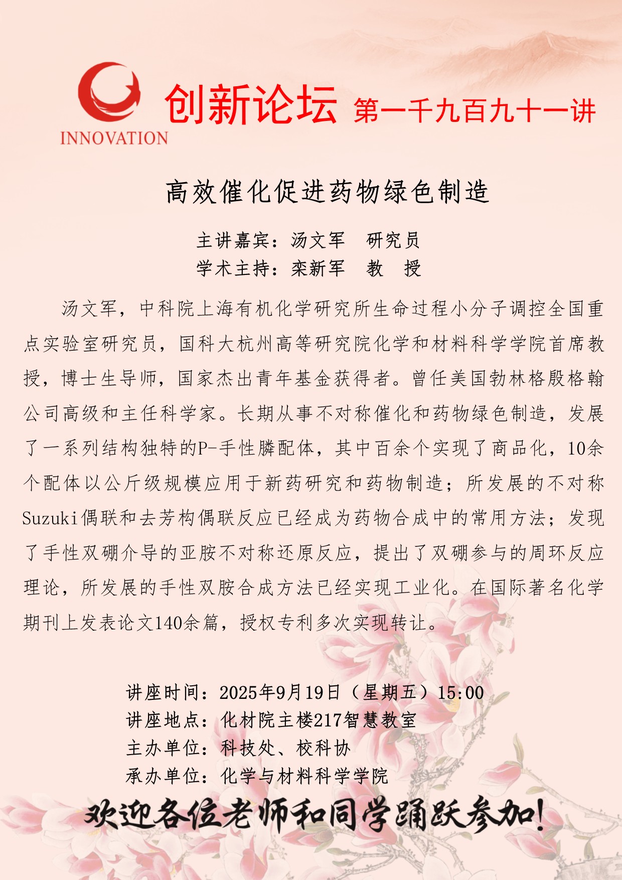 汤文军 研究员 开云手机网页版登录入口创新论坛第一千九百九十一讲:高效催化促进药物绿色制造 讲座时间 2025年9月19日(星期五)15:00 讲座地点 化材院主楼217智慧教室 讲座人介绍 汤文军 研究员 讲座内容
