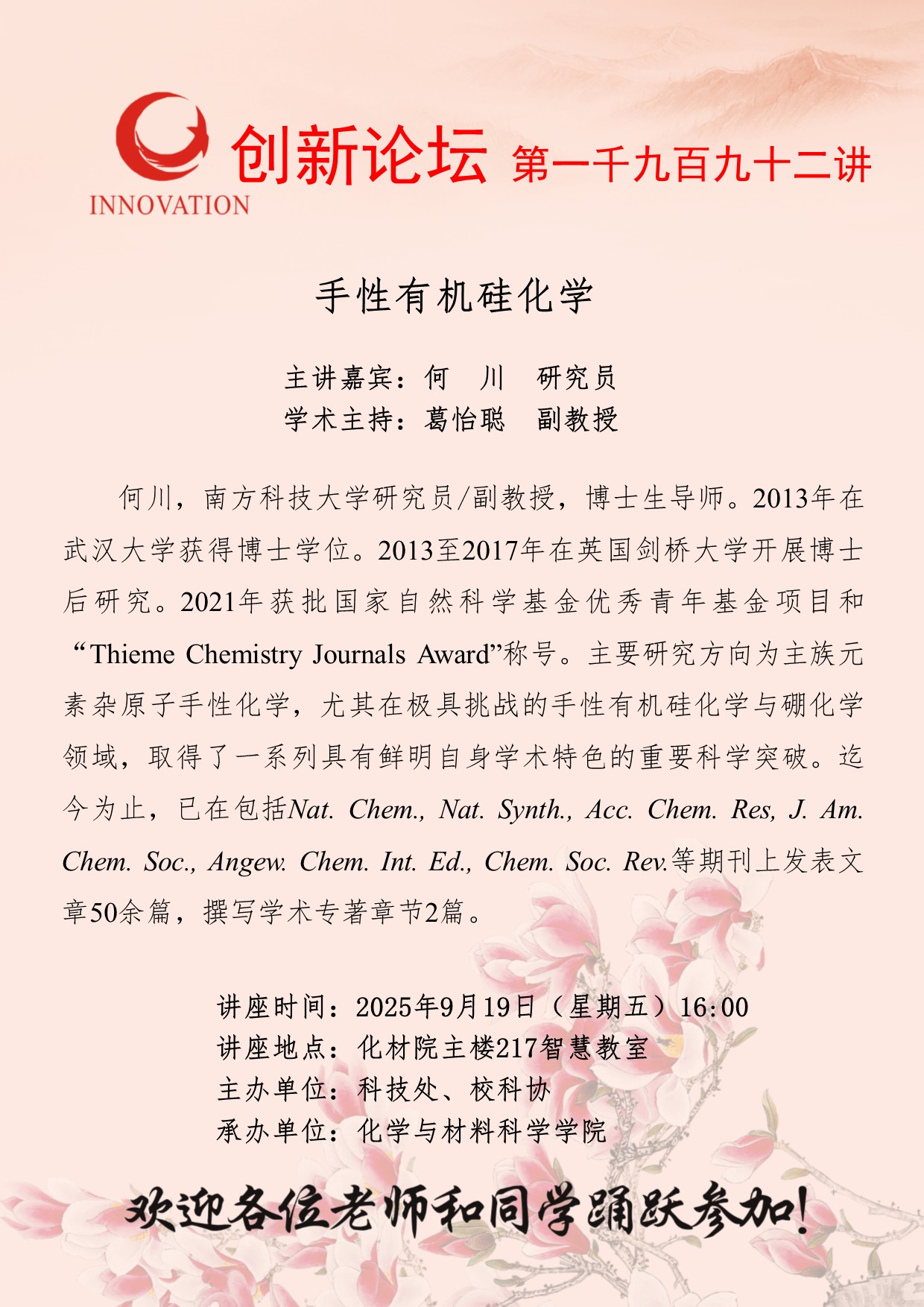 何川 研究员 开云手机网页版登录入口创新论坛第一千九百九十二讲:手性有机硅化学 讲座时间 2025年9月19日(星期五)16:00 讲座地点 化材院主楼217智慧教室 讲座人介绍 何川 研究员 讲座内容