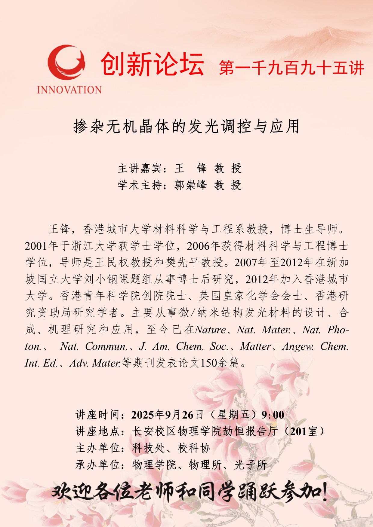 王锋 教授 开云手机网页版登录入口创新论坛第一千九百九十五讲:掺杂无机晶体的发光调控与应用 讲座时间 2025年9月26日(星期五)9:00 讲座地点 长安校区物理学院劼恒报告厅(201室) 讲座人介绍 王锋 教授 讲座内容