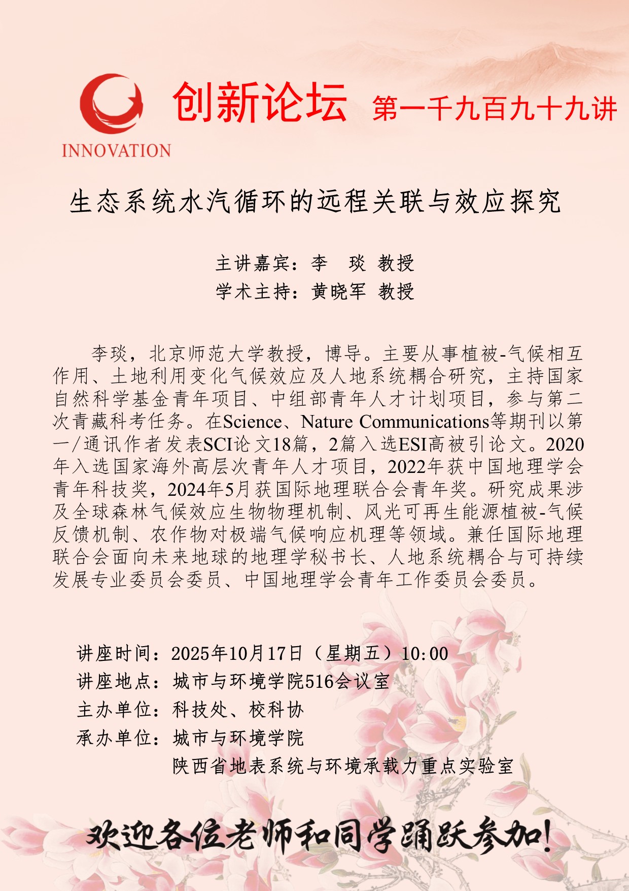李 琰 教授 开云手机网页版登录入口创新论坛第一千九百九十九讲:生态系统水汽循环的远程关联与效应探究 讲座时间 2025年10月17日(星期五)10:00 讲座地点 城市与环境学院516会议室 讲座人介绍 李 琰 教授 讲座内容