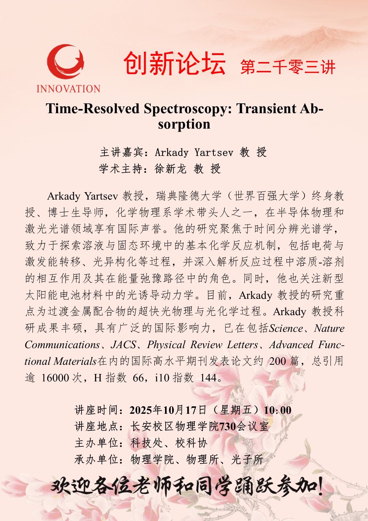 Arkady Yartsev 教授 开云手机网页版登录入口创新论坛第二千零三讲:Time-Resolved Spectroscopy: Transient Absorption 讲座时间 2025年10月17日(星期五)10:00 讲座地点 长安校区物理学院730会议室 讲座人介绍 Arkady Yartsev 教授 讲座内容