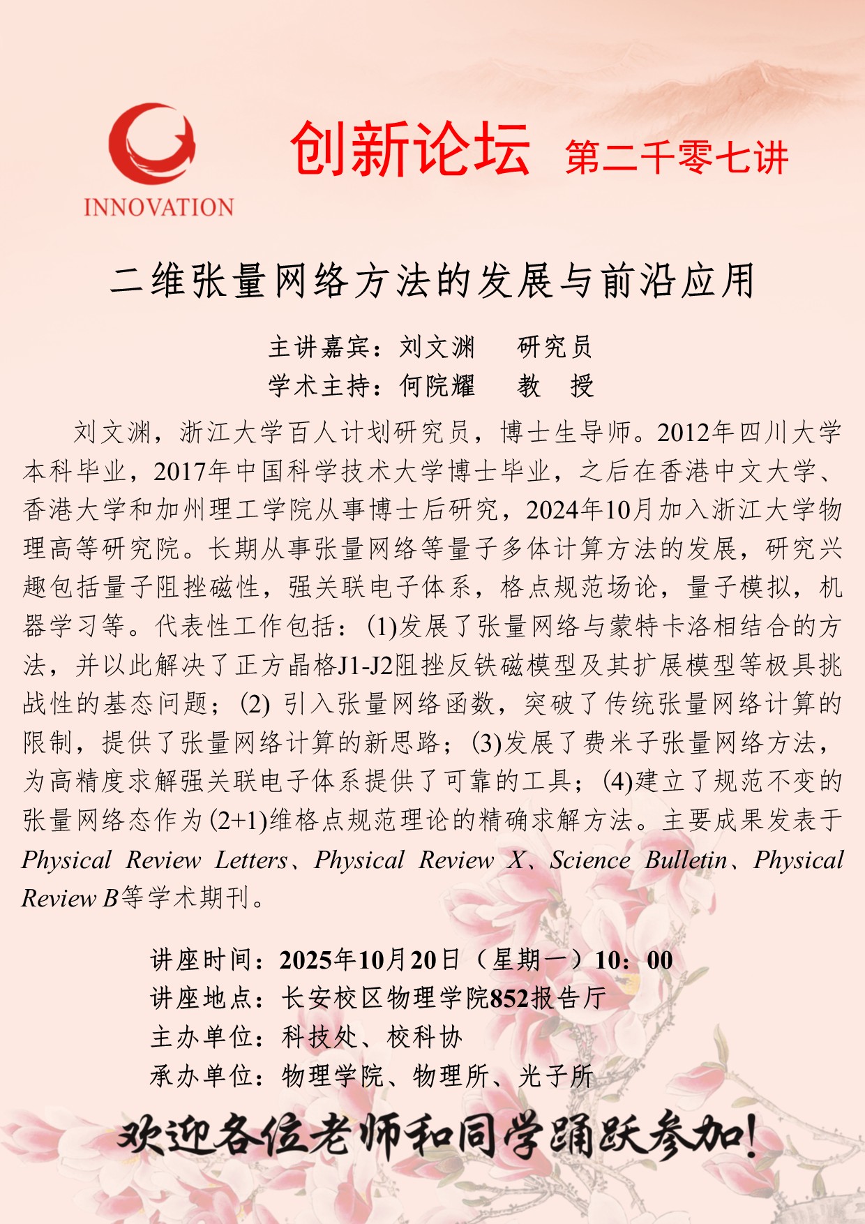 刘文渊 研究员 开云手机网页版登录入口创新论坛第二千零七讲:二维张量网络方法的发展与前沿应用 讲座时间 2025年10月20日(星期一)10:00 讲座地点 长安校区物理学院852报告厅 讲座人介绍 刘文渊 研究员 讲座内容