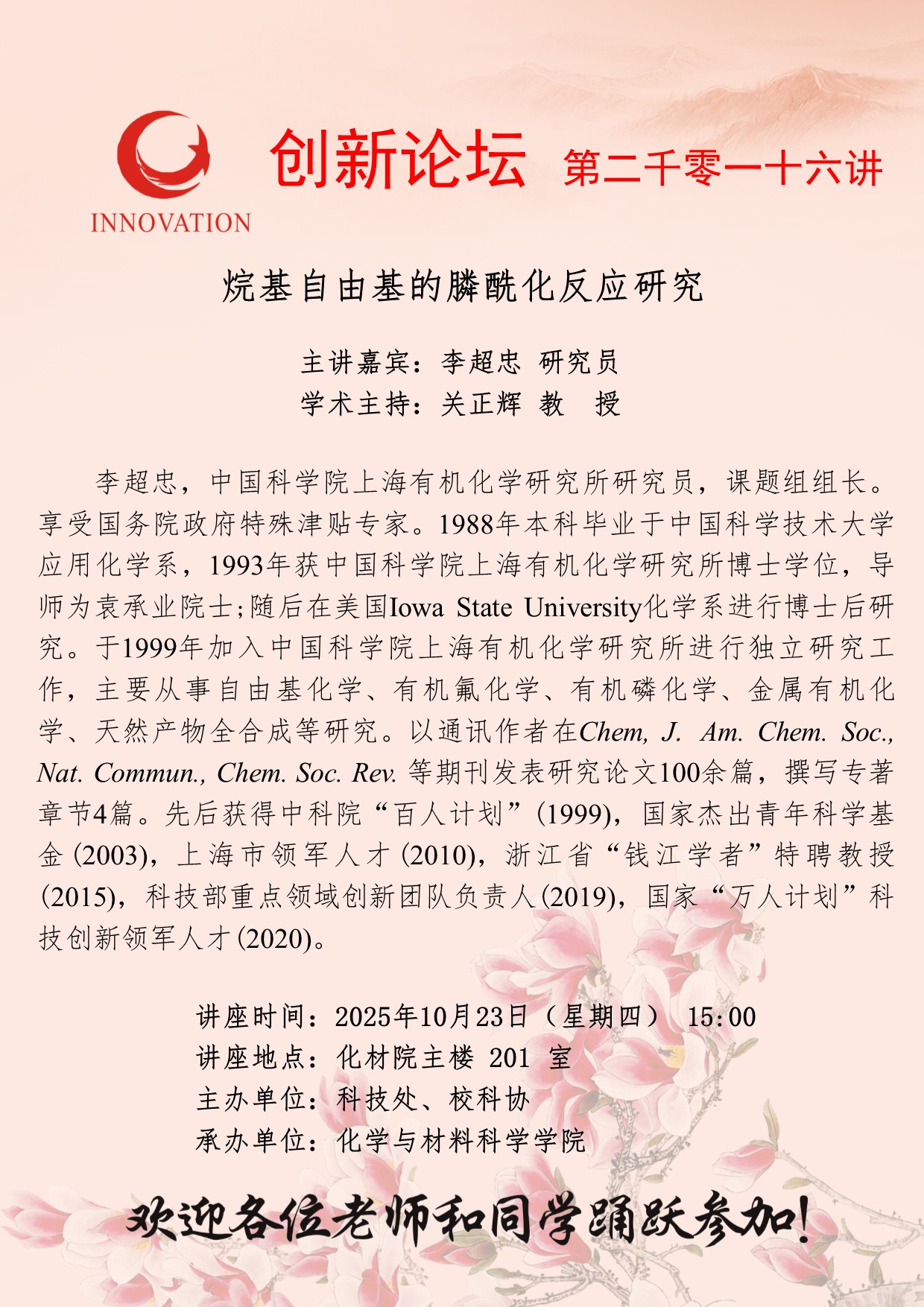 李超忠 研究员 开云手机网页版登录入口创新论坛第二千零一十六讲:烷基自由基的膦酰化反应研究 讲座时间 2025年10月23日(星期四) 15:00 讲座地点 化材院主楼 201 室 讲座人介绍 李超忠 研究员 讲座内容