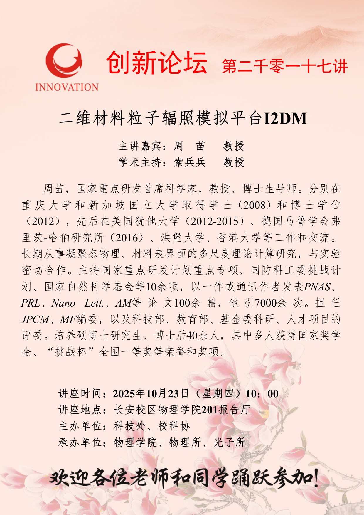 周苗 教授 开云手机网页版登录入口创新论坛第二千零一十七讲:二维材料粒子辐照模拟平台I2DM 讲座时间 2025年10月23日(星期四)10:00 讲座地点 长安校区物理学院201报告厅 讲座人介绍 周苗 教授 讲座内容