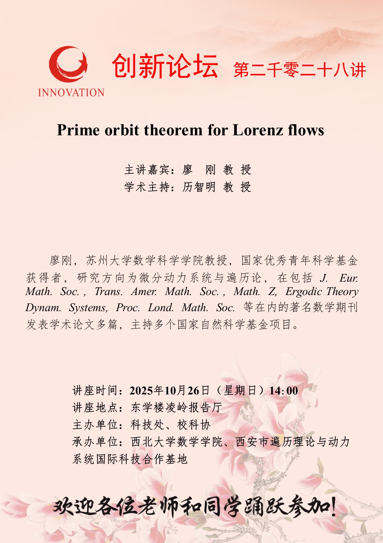 廖 刚 教 授 开云手机网页版登录入口创新论坛第二千零二十八讲:Prime orbit theorem for Lorenz flows 讲座时间 2025年10月26日(星期日)14:00 讲座地点 东学楼凌岭报告厅 讲座人介绍 廖 刚 教 授 讲座内容