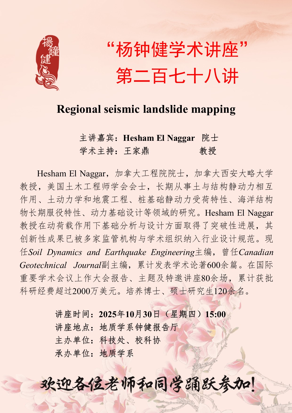 Hesham El Naggar 院士 “杨钟健学术讲座”第二百七十八讲:Regional seismic landslide mapping 讲座时间 2025年10月30日(星期四)15:00 讲座地点 地质学系钟健报告厅 讲座人介绍 Hesham El Naggar 院士 讲座内容