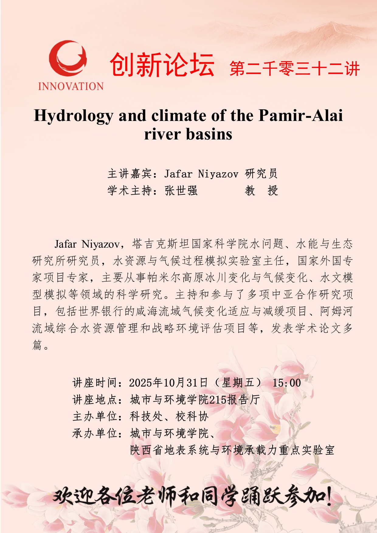 Jafar Niyazov 研究员 开云手机网页版登录入口创新论坛第二千零三十二讲:Hydrology and climate of the Pamir-Alai river basins 讲座时间 2025年10月31日(星期五) 15:00 讲座地点 城市与环境学院215报告厅 讲座人介绍 Jafar Niyazov 研究员 讲座内容