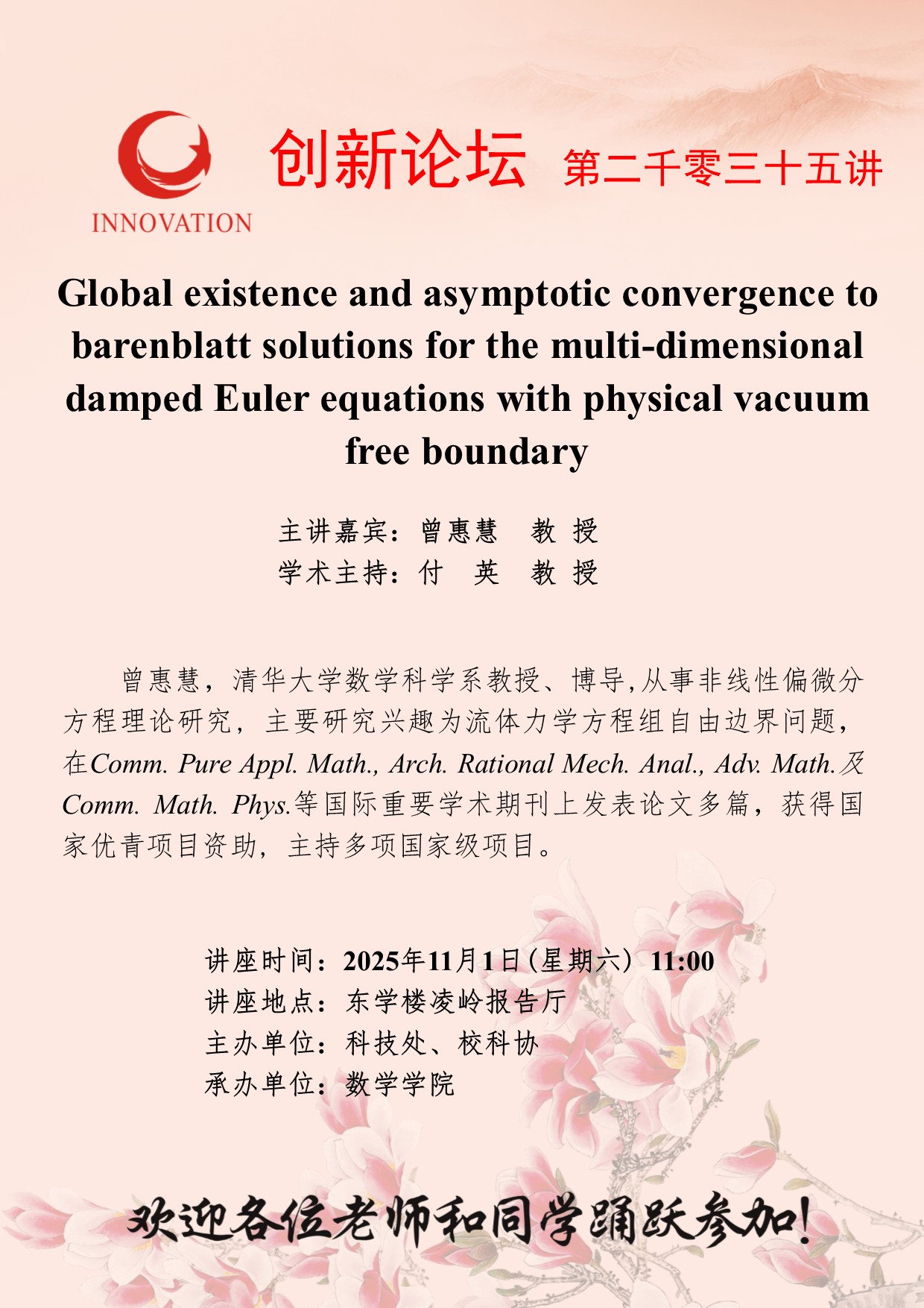 曾惠慧 教 授 开云手机网页版登录入口创新论坛第二千零三十五讲:Global existence and asymptotic convergence to barenblatt solutions for the multi-dimensional damped Euler equations with physical vacuum free boundary 讲座时间 2025年11月1日(星期六) 11:00 讲座地点 东学楼凌岭报告厅 讲座人介绍 曾惠慧 教 授 讲座内容