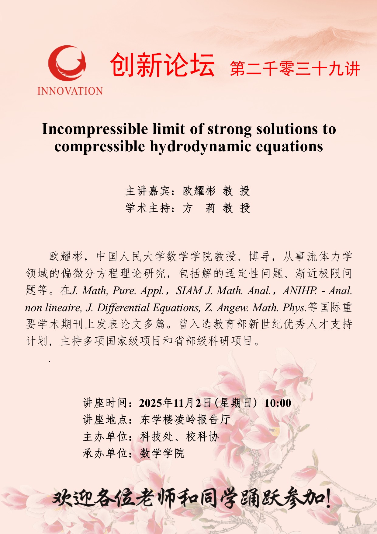 欧耀彬 教 授 开云手机网页版登录入口创新论坛第二千零三十九讲:Incompressible limit of strong solutions to compressible hydrodynamic equations 讲座时间 2025年11月2日(星期日) 10:00 讲座地点 东学楼凌岭报告厅 讲座人介绍 欧耀彬 教 授 讲座内容