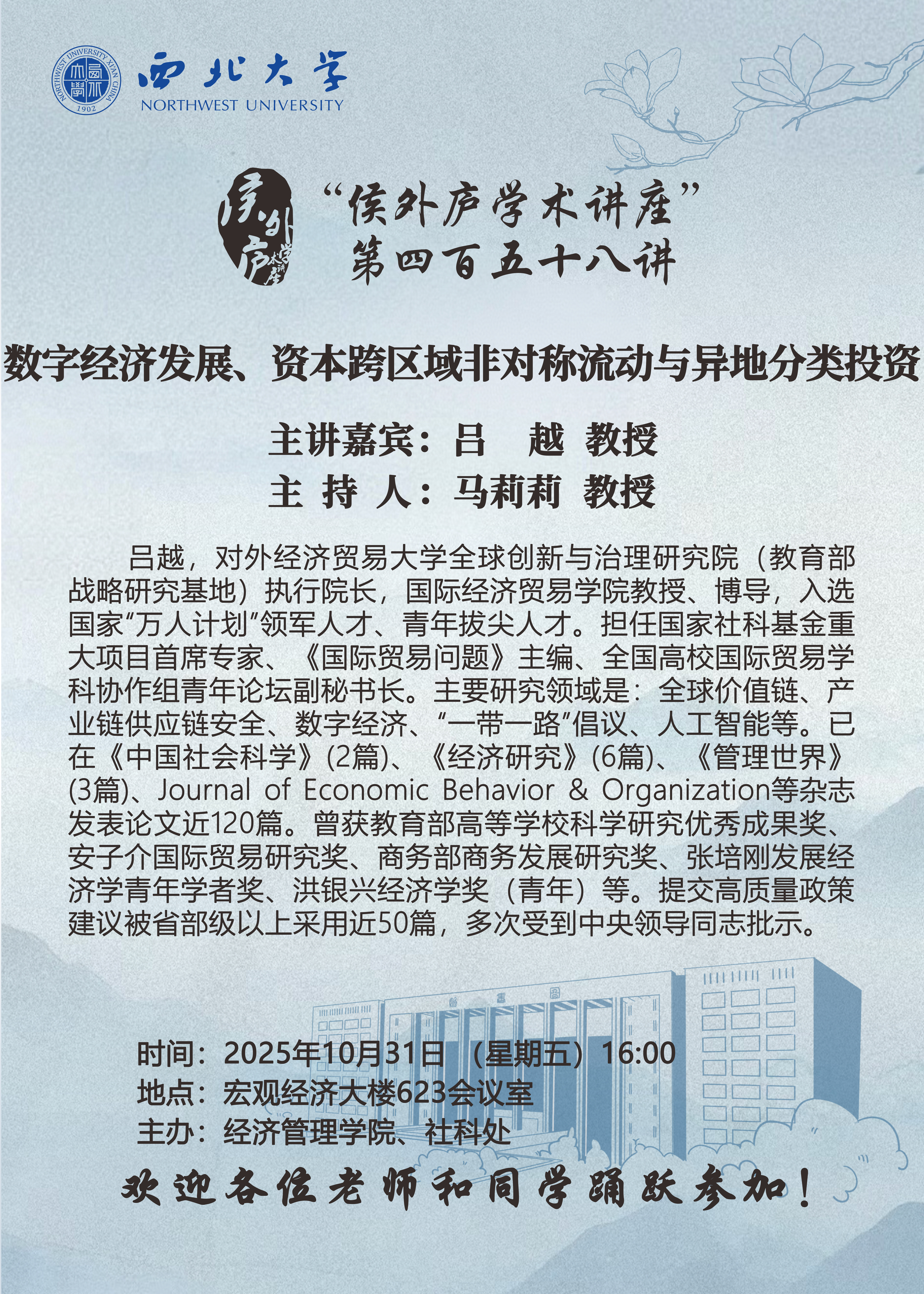 吕越 教授 “侯外庐学术讲座”第四百五十八讲:数字经济发展、资本跨区域非对称流动与异地分类投资 讲座时间 2025年10月31日(星期五)16:00 讲座地点 宏观经济大楼623会议室 讲座人介绍 吕越 教授 讲座内容