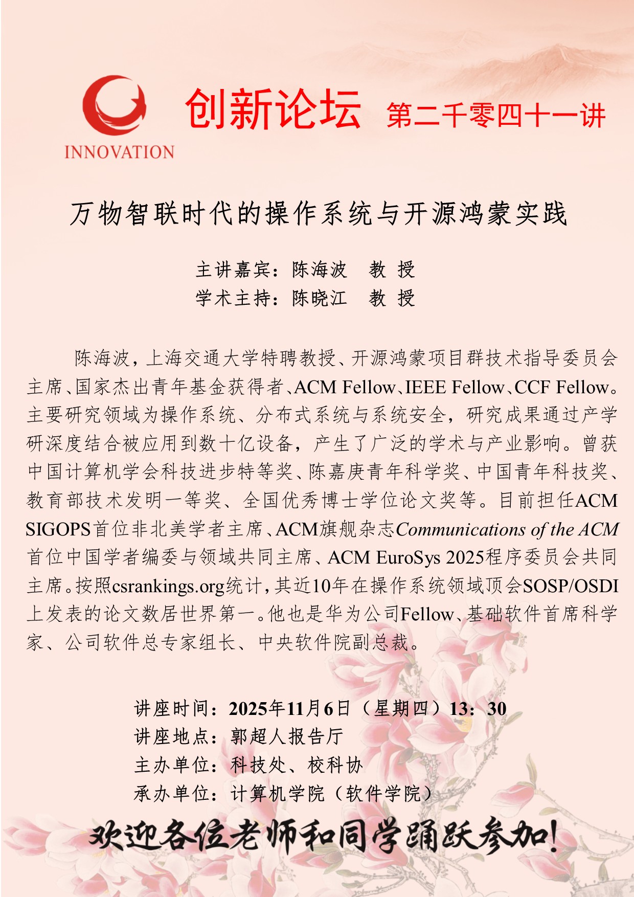陈海波 教授 开云手机网页版登录入口创新论坛第二千零四十一讲:万物智联时代的操作系统与开源鸿蒙实践 讲座时间 2025年11月6日(星期四)13:30 讲座地点 郭超人报告厅 讲座人介绍 陈海波 教授 讲座内容