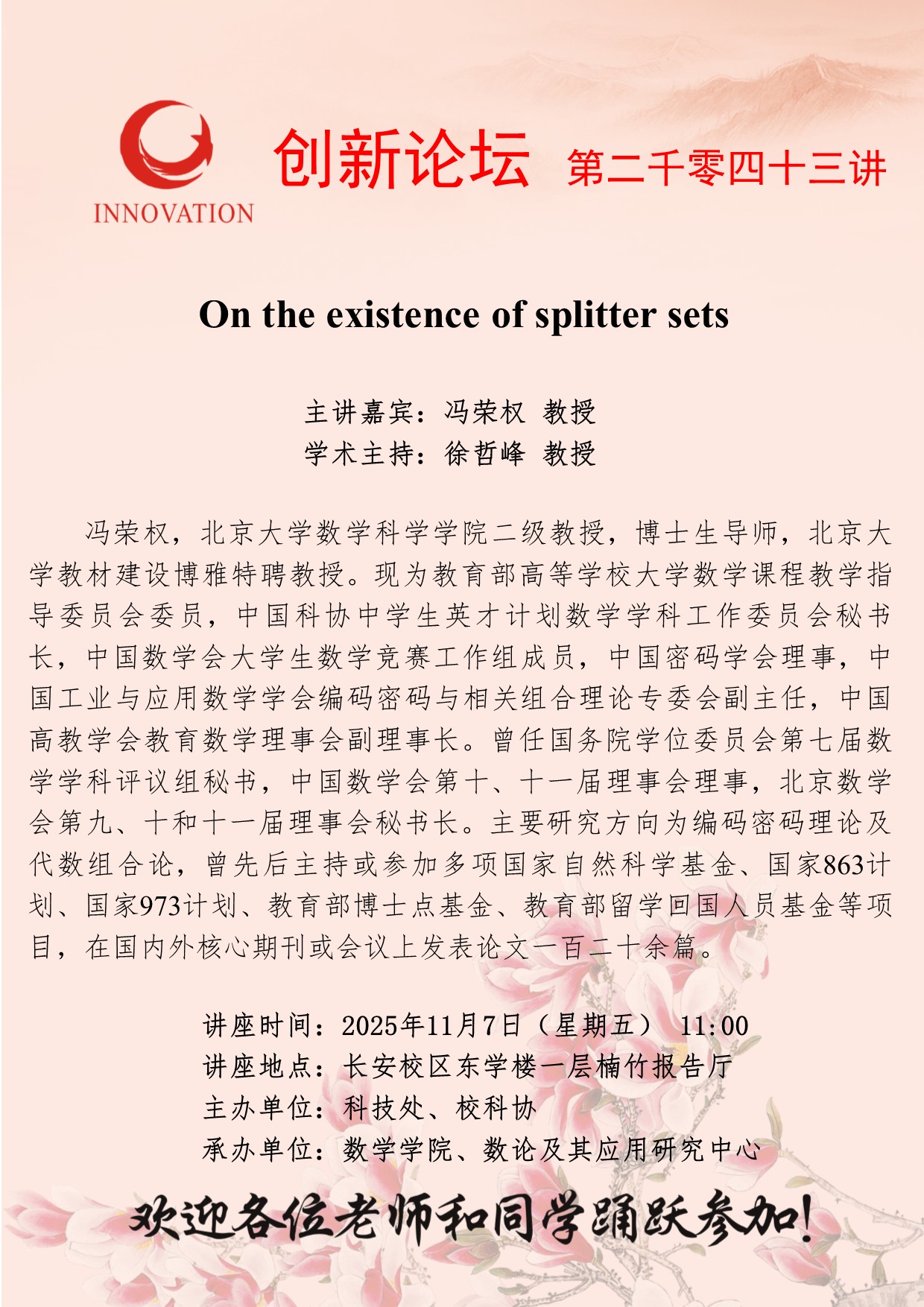 冯荣权 教授 开云手机网页版登录入口创新论坛第二千零四十三讲:On the existence of splitter sets 讲座时间 2025年11月7日(星期五) 11:00 讲座地点 长安校区东学楼一层楠竹报告厅 讲座人介绍 冯荣权 教授 讲座内容