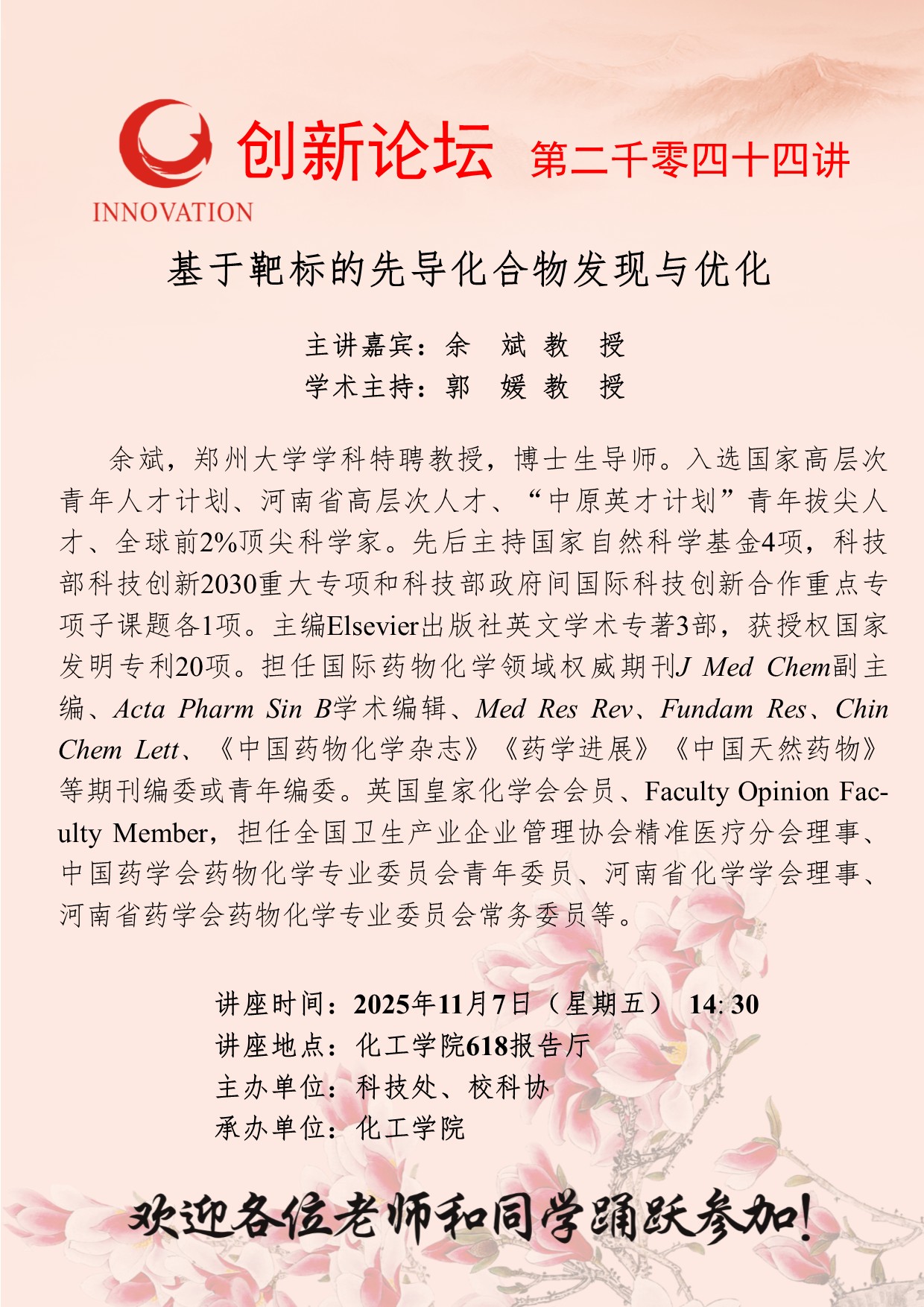 余斌 教授 开云手机网页版登录入口创新论坛第二千零四十四讲:基于靶标的先导化合物发现与优化 讲座时间 2025年11月7日(星期五) 14: 30 讲座地点 化工学院618报告厅 讲座人介绍 余斌 教授 讲座内容