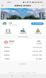 1.进入开云手机网页版登录入口移动校园应用,点击“Y.移动访客”,进入“智慧校园 移动接访”,通过分享申请码或代客申请提交访客申请信息。