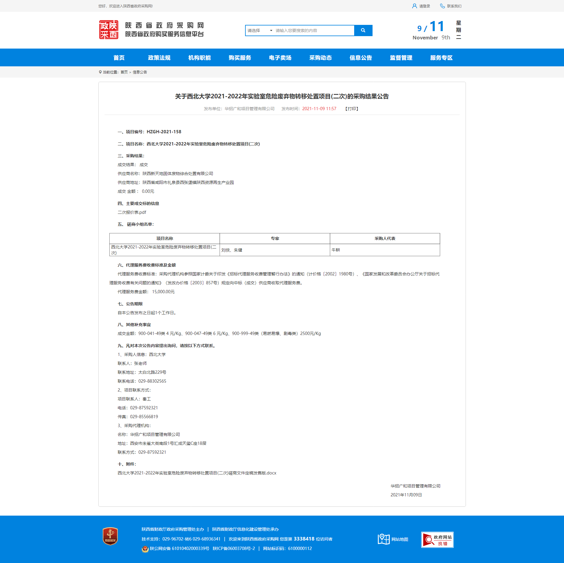 关于开云手机网页版登录入口2021-2022年实验室危险废弃物转移处置项目(二次)的采购结果公告
