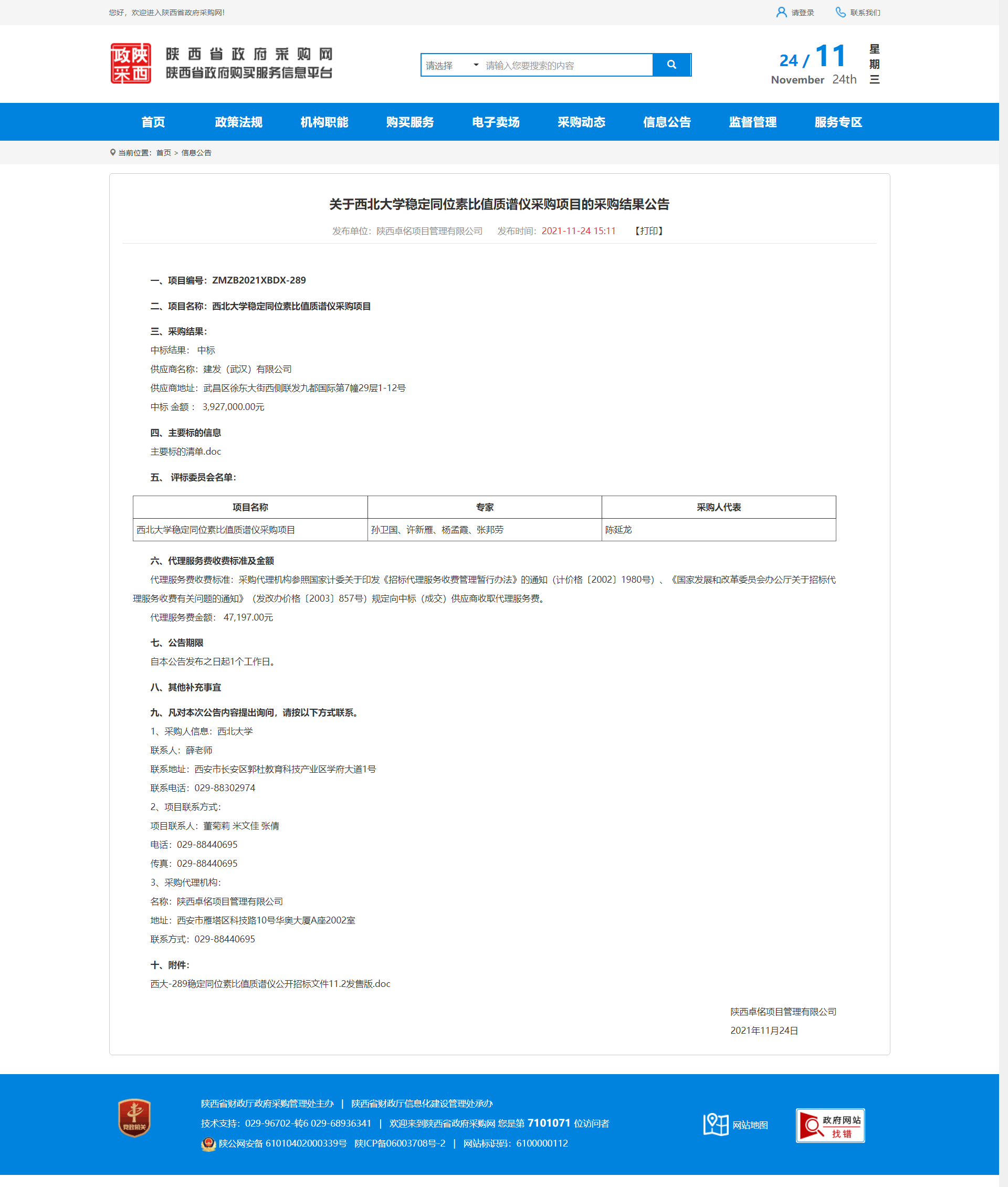 关于开云手机网页版登录入口稳定同位素比值质谱仪采购项目的采购结果公告 作者: 编辑:薛利娟 时间:2021-11-24 原公告网址:http://www.ccgp-shaanxi.gov.cn/notice/noticeDetail.do?noticeguid=8a85be347d2d6f8d017d50c513e326e6