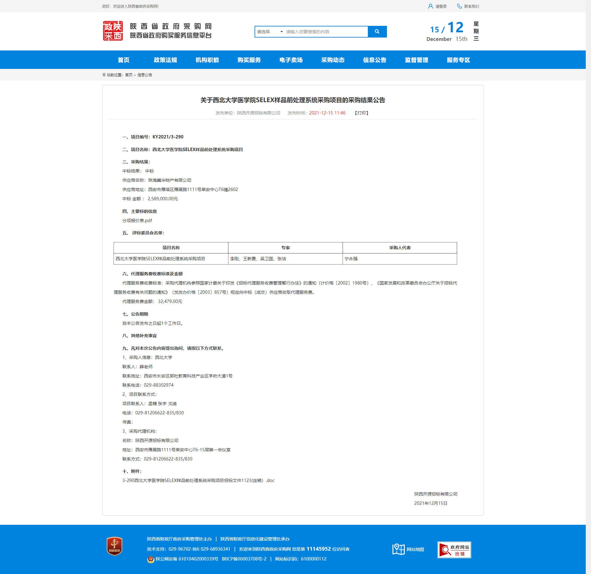 关于开云手机网页版登录入口医学院SELEX样品前处理系统采购项目的采购结果公告 作者: 编辑:薛利娟 时间:2021-12-15 原公告链接:http://www.ccgp-shaanxi.gov.cn/notice/noticeDetail.do?noticeguid=8a85be347dace9e6017dbc2606f522a9