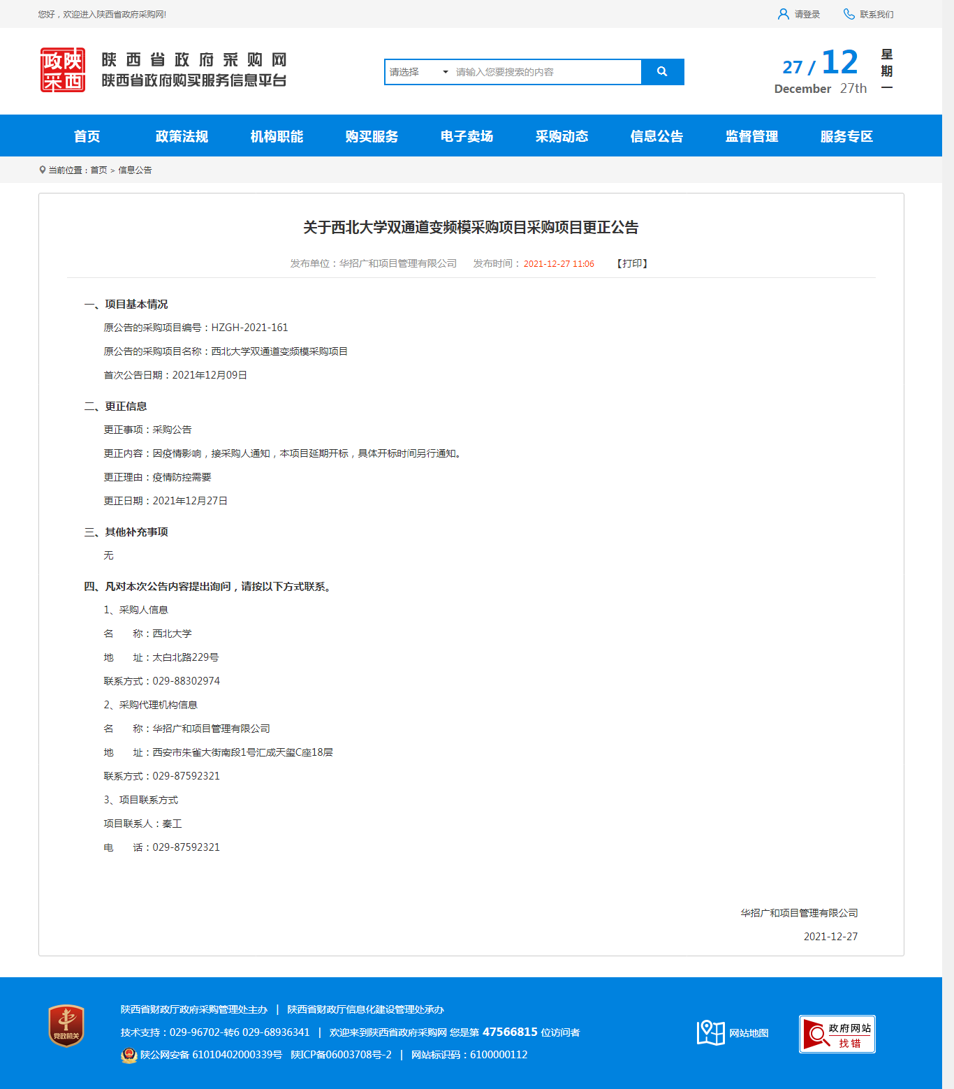 关于开云手机网页版登录入口双通道变频模采购项目采购项目更正公告 作者: 编辑:薛利娟 时间:2021-12-27 原公告链接:http://ccgp-shaanxi.gov.cn/notice/noticeDetail.do?noticeguid=8a85be347dace9e6017dea8c118f786a