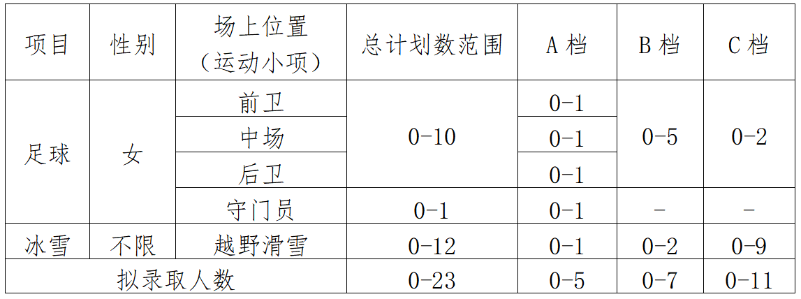 注:1.开云手机网页版登录入口原则上按照A档、B档、C档已公布招生计划的1:1比例确定相应的优惠等级考生名单;若全国统测体育专项分相同,则比较指定的子项目分数或成绩(①越野滑雪比较测试滑行速度成绩(秒)。②足球非守门员依次比较实战能力(比赛)技术成绩、传准技术成绩、运射技术成绩、5×25米折返跑技术成绩;足球守门员依次比较实战能力(比赛)技术成绩、扑接球成绩、掷远与踢远成绩、立定三级跳远成绩。)。