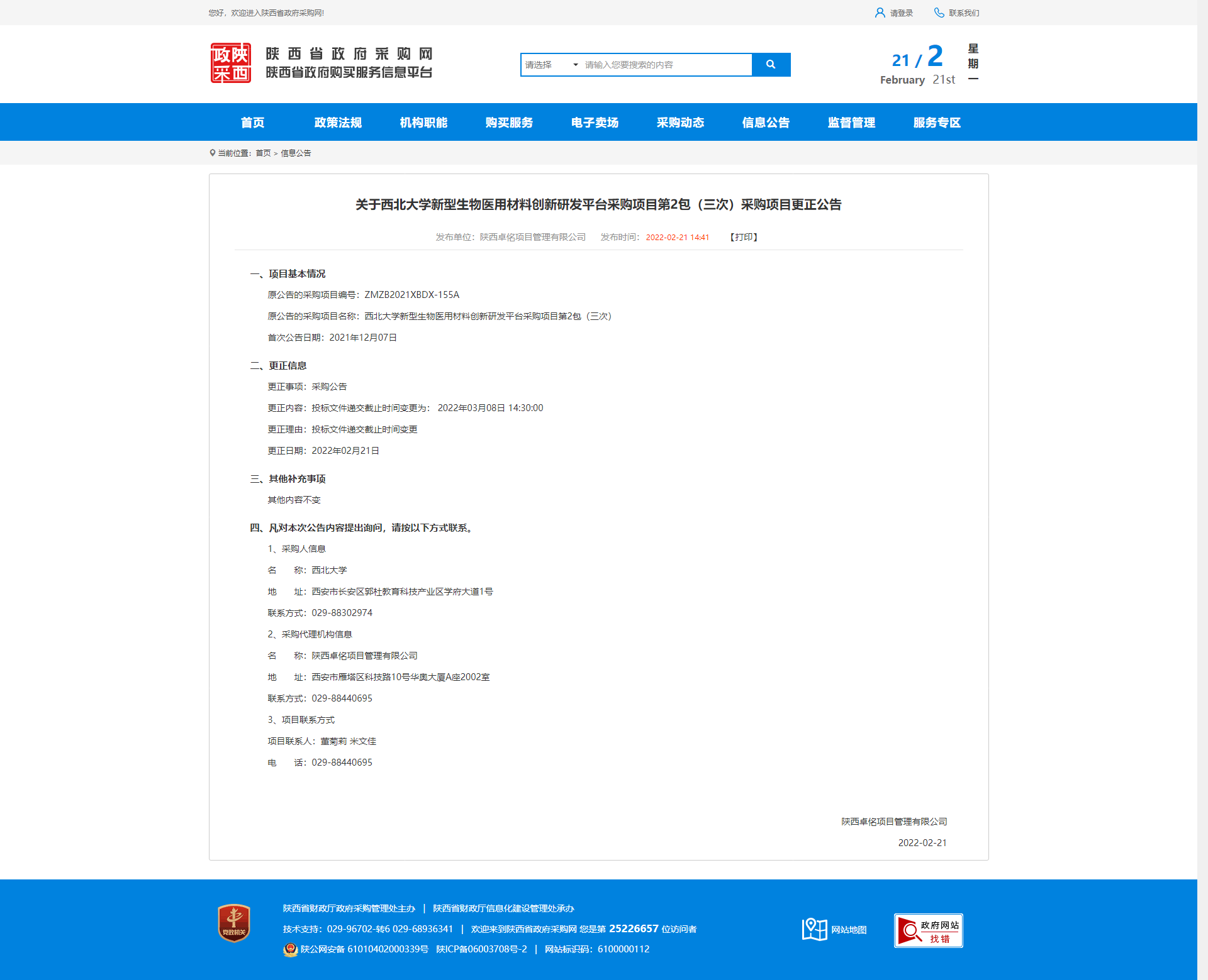 关于开云手机网页版登录入口新型生物医用材料创新研发平台采购项目第2包(三次)采购项目更正公告 作者: 编辑:薛利娟 时间:2022-02-21 原公告链接:http://www.ccgp-shaanxi.gov.cn/notice/noticeDetail.do?noticeguid=8a85be317ee7907d017f1a9fc1d146e6