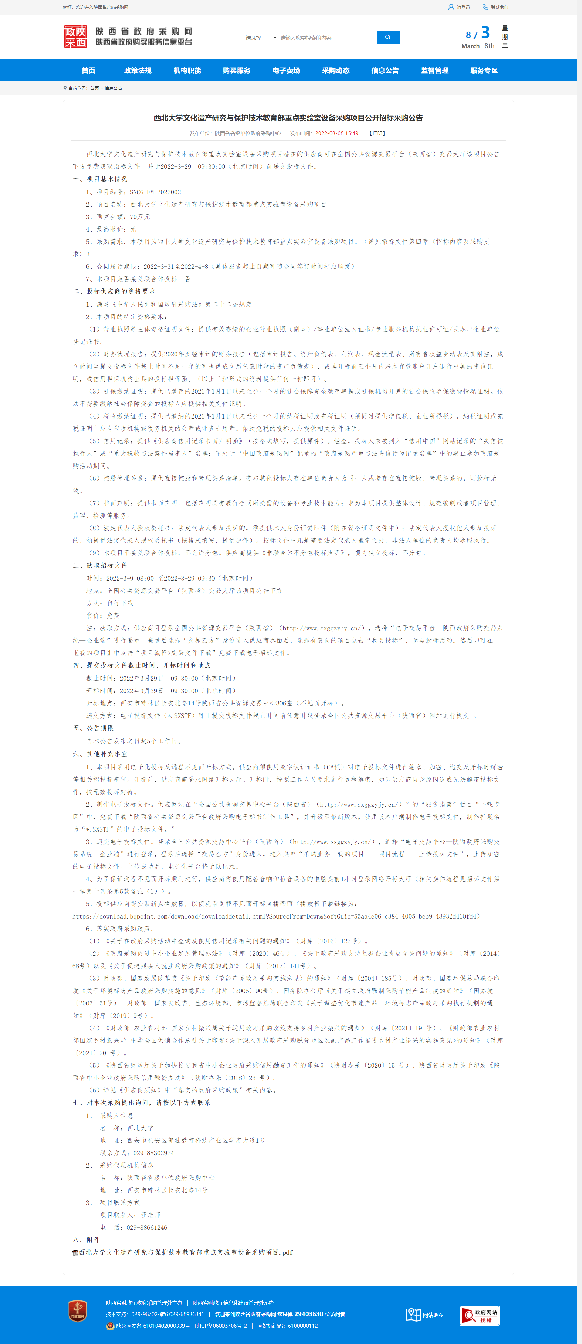 开云手机网页版登录入口文化遗产研究与保护技术教育部重点实验室设备采购项目公开招标采购公告 作者: 编辑:薛利娟 时间:2022-03-08 原公告链接:http://www.ccgp-shaanxi.gov.cn/notice/noticeDetail.do?noticeguid=8a85be387e22c8ad017f687dcc81045b