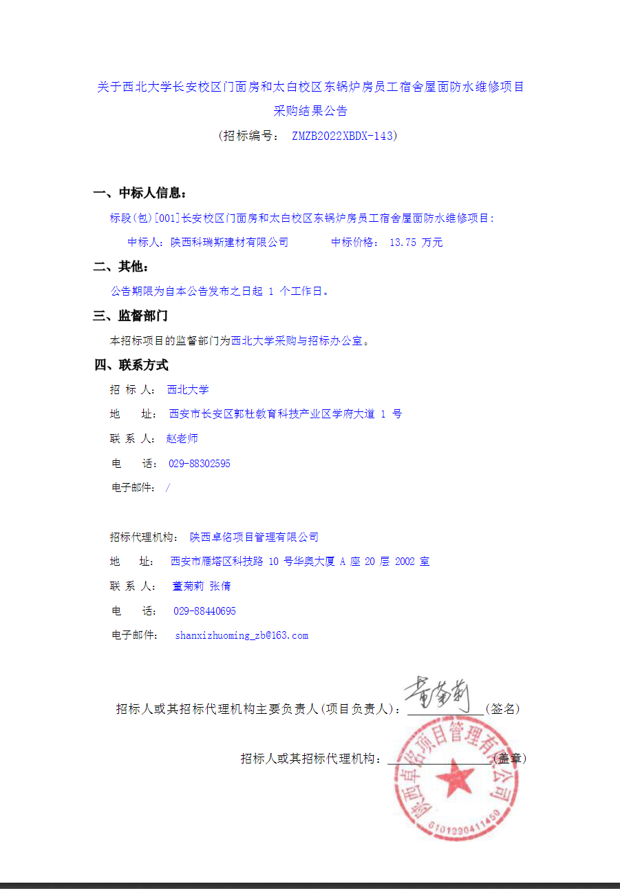 关于开云手机网页版登录入口长安校区门面房和太白校区东锅炉房员工宿舍屋面防水维修项目采购结果公告