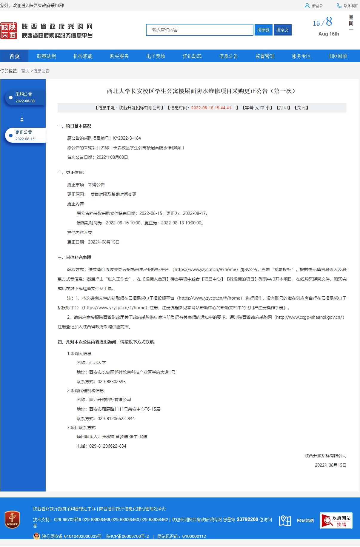 开云手机网页版登录入口长安校区学生公寓楼屋面防水维修项目采购更正公告(第一次)