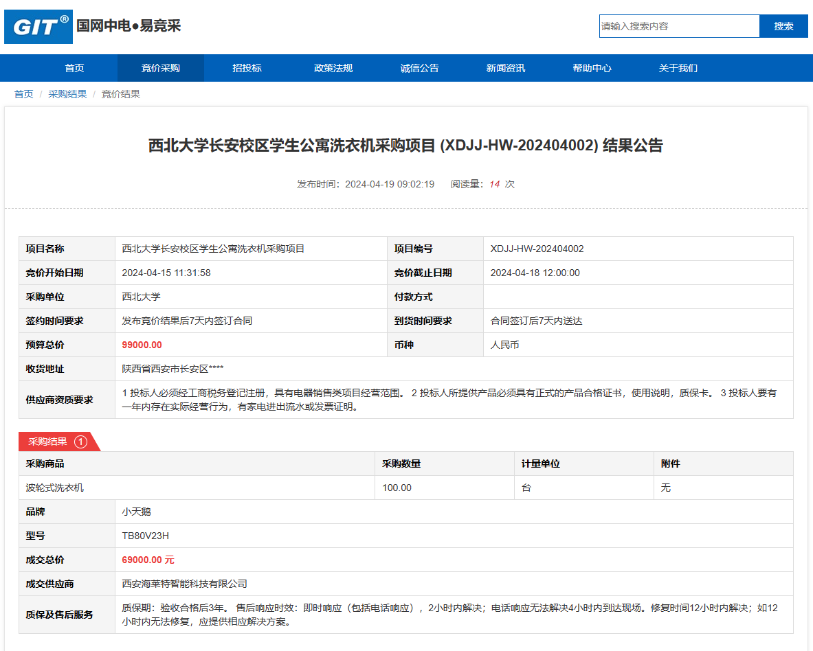 开云手机网页版登录入口长安校区学生公寓洗衣机采购项目 (XDJJ-HW-202404002) 竞价结果公告 作者: 编辑: 时间:2024-04-19 原公告链接:https://www.ejingcai.com.cn/site/bidding/detail/9576