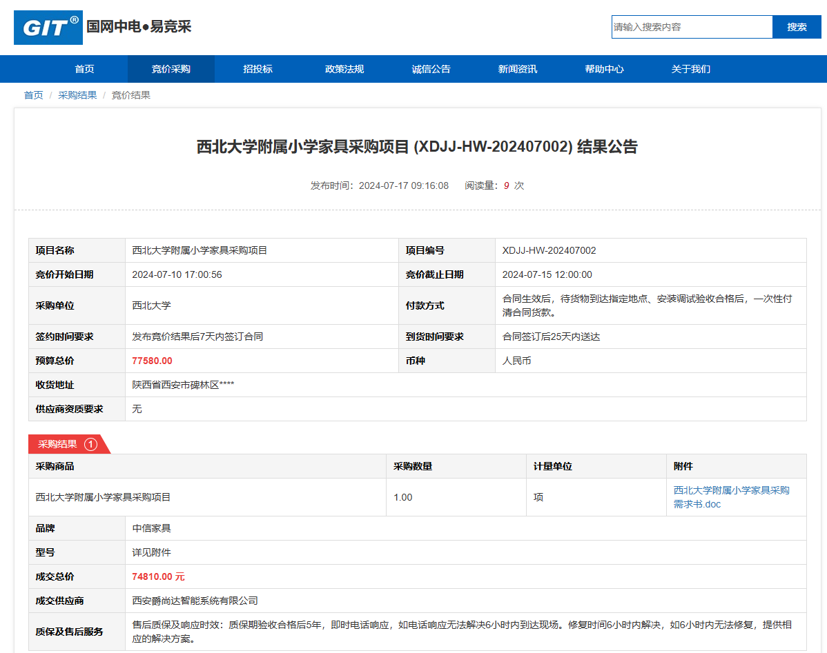 开云手机网页版登录入口附属小学家具采购项目 (XDJJ-HW-202407002) 竞价结果公告 作者: 编辑: 时间:2024-07-17 原公告链接:https://www.ejingcai.com.cn/site/bidding/detail/11713
