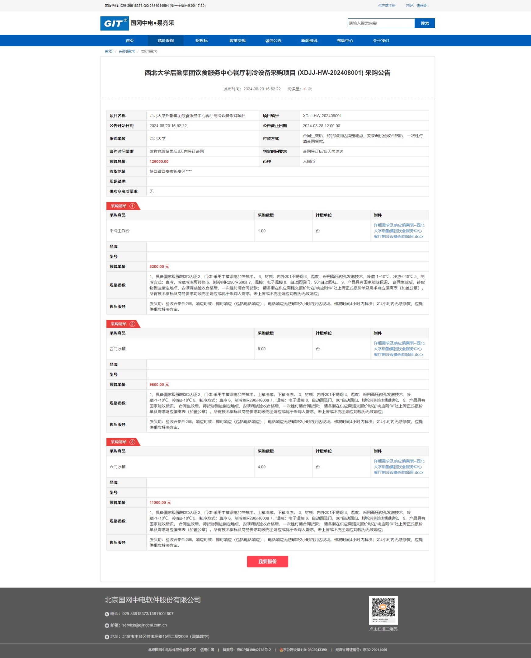 开云手机网页版登录入口后勤集团饮食服务中心餐厅制冷设备采购项目 (XDJJ-HW-202408001) 竞价公告 作者: 编辑:采购与招标办公室 时间:2024-08-23 原公告链接:https://www.ejingcai.com.cn/site/bidding/detail/12189