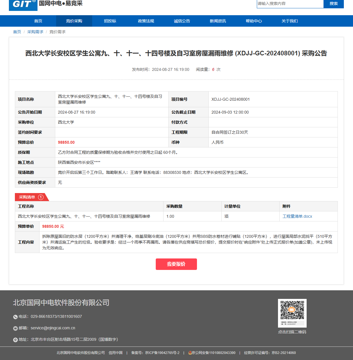 开云手机网页版登录入口长安校区学生公寓九、十、十一、十四号楼及自习室房屋漏雨维修 (XDJJ-GC-202408001) 竞价采购公告 作者: 编辑: 时间:2024-08-27 原公告链接:https://www.ejingcai.com.cn/site/bidding/detail/12232